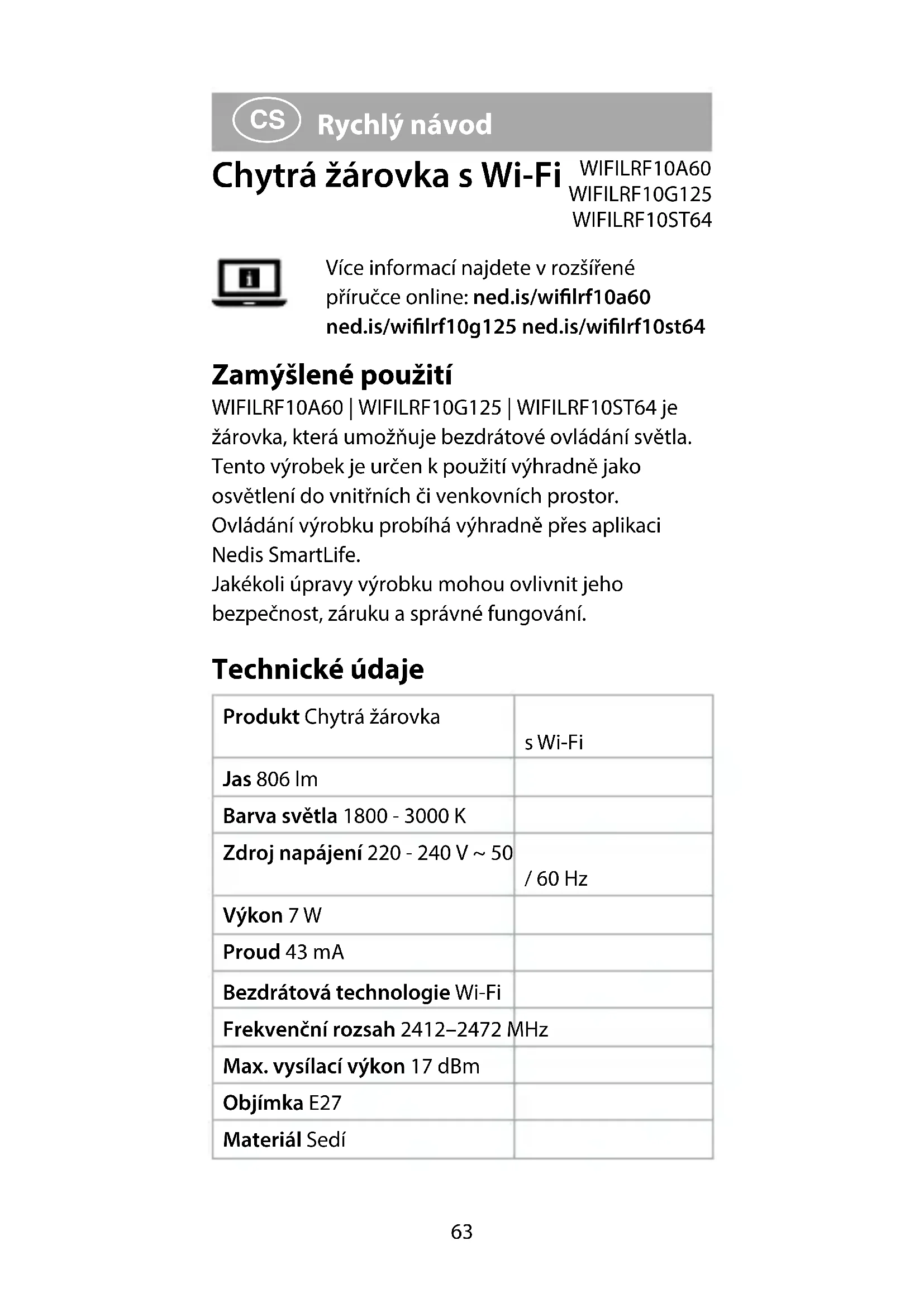 Rychlý návod Chytrá žárovka s Wi-Fi WIFILRF10A60 WIFILRF10G125 WIFILRF10ST64 Více informací najdete v rozšířené příručce online: ned.is/wilrf10a60 ned.is/wilrf10g125 ned.is/wilrf10st64 Zamýšlené použití WIFILRF10A60 | WIFILRF10G125 | WIFILRF10ST64 je žárovka, která umožňuje bezdrátové ovládání světla. Tento výrobek je určen k použití výhradně jako osvětlení do vnitřních či venkovních prostor. Ovládání výrobku probíhá výhradně přes aplikaci Nedis SmartLife. Jakékoli úpravy výrobku mohou ovlivnit jeho bezpečnost, záruku a správné fungování. Technické údaje Produkt Chytrá žárovka s Wi-Fi Jas 806lm Barva světla 1800 - 3000 K Zdroj napájení 220 - 240 V ~ 50 / 60 Hz Výkon 7 W Proud 43 mA Bezdrátová technologie Wi-Fi Frekvenční rozsah 2412–2472 MHz Max. vysílací výkon 17 dBm Objímka E27 Materiál Sedí64 Číslo položky Rozměry Hmotnost WIFILRF10A60 Ø 60 x 105 mm 30 g WIFILRT10G125 Ø 125 x 172 mm 100 g WIFILRF10ST64 Ø 64 x 142 mm 46 g Hlavní části (obrázek A) 1 Žárovka 2 Vlákno 3 Elektrický kontakt Bezpečnostní pokyny