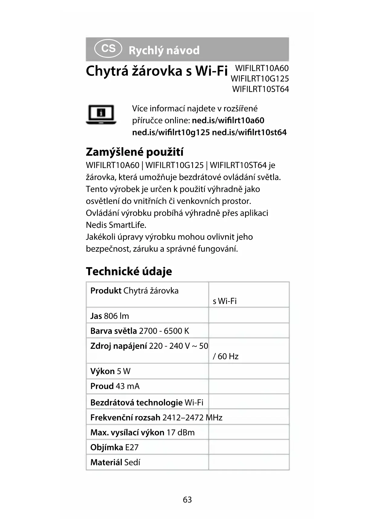 Rychlý návod Chytrá žárovka s Wi-Fi WIFILRT10A60 WIFILRT10G125 WIFILRT10ST64 Více informací najdete v rozšířené příručce online: ned.is/wilrt10a60 ned.is/wilrt10g125 ned.is/wilrt10st64 Zamýšlené použití WIFILRT10A60 | WIFILRT10G125 | WIFILRT10ST64 je žárovka, která umožňuje bezdrátové ovládání světla. Tento výrobek je určen k použití výhradně jako osvětlení do vnitřních či venkovních prostor. Ovládání výrobku probíhá výhradně přes aplikaci Nedis SmartLife. Jakékoli úpravy výrobku mohou ovlivnit jeho bezpečnost, záruku a správné fungování. Technické údaje Produkt Chytrá žárovka s Wi-Fi Jas 806lm Barva světla 2700 - 6500 K Zdroj napájení 220 - 240 V ~ 50 / 60 Hz Výkon 5 W Proud 43 mA Bezdrátová technologie Wi-Fi Frekvenční rozsah 2412–2472 MHz Max. vysílací výkon 17 dBm Objímka E27 Materiál Sedí64 Číslo položky Rozměry Hmotnost WIFILRT10A60 Ø 60 x 105 mm 30 g WIFILRT10G125 Ø 125 x 172 mm 100 g WIFILRT10ST64 Ø 64 x 142 mm 46 g Hlavní části (obrázek A) 1 Žárovka 2 Vlákno 3 Elektrický kontakt Bezpečnostní pokyny