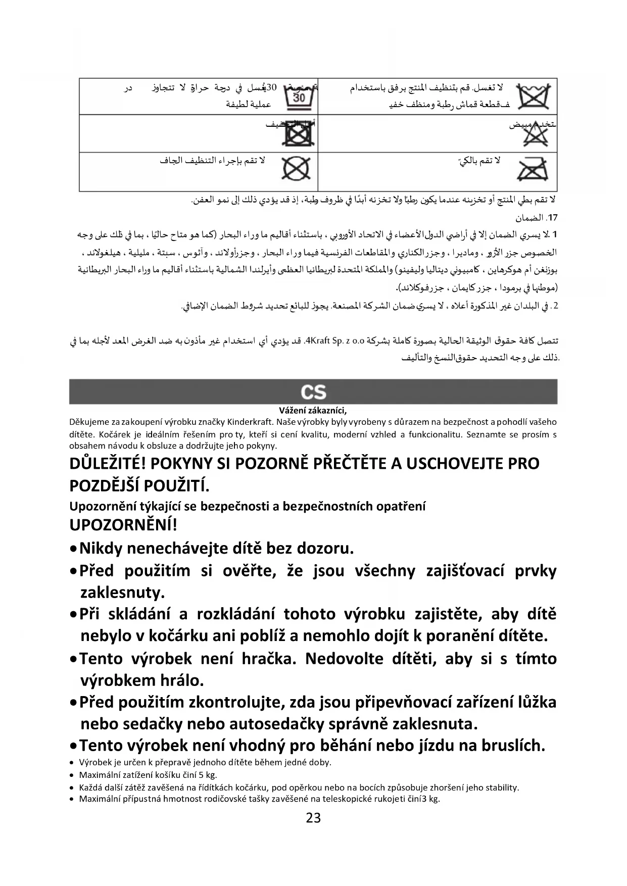 Vážení zákazníci, Děkujeme za zakoupení výrobku značky Kinderkraft. Naše výrobky byly vyrobeny s důrazem na bezpečnost a pohodlí vašeho dítěte. Kočárek je ideálním řešením pro ty, kteří si cení kvalitu, moderní vzhled a funkcionalitu. Seznamte se prosím s obsahem návodu k obsluze a dodržujte jeho pokyny. DŮLEŽITÉ! POKYNY SI POZORNĚ PŘEČTĚTE A USCHOVEJTE PRO POZDĚJŠÍ POUŽITÍ. Upozornění týkající se bezpečnosti a bezpečnostních opatření UPOZORNĚNÍ!