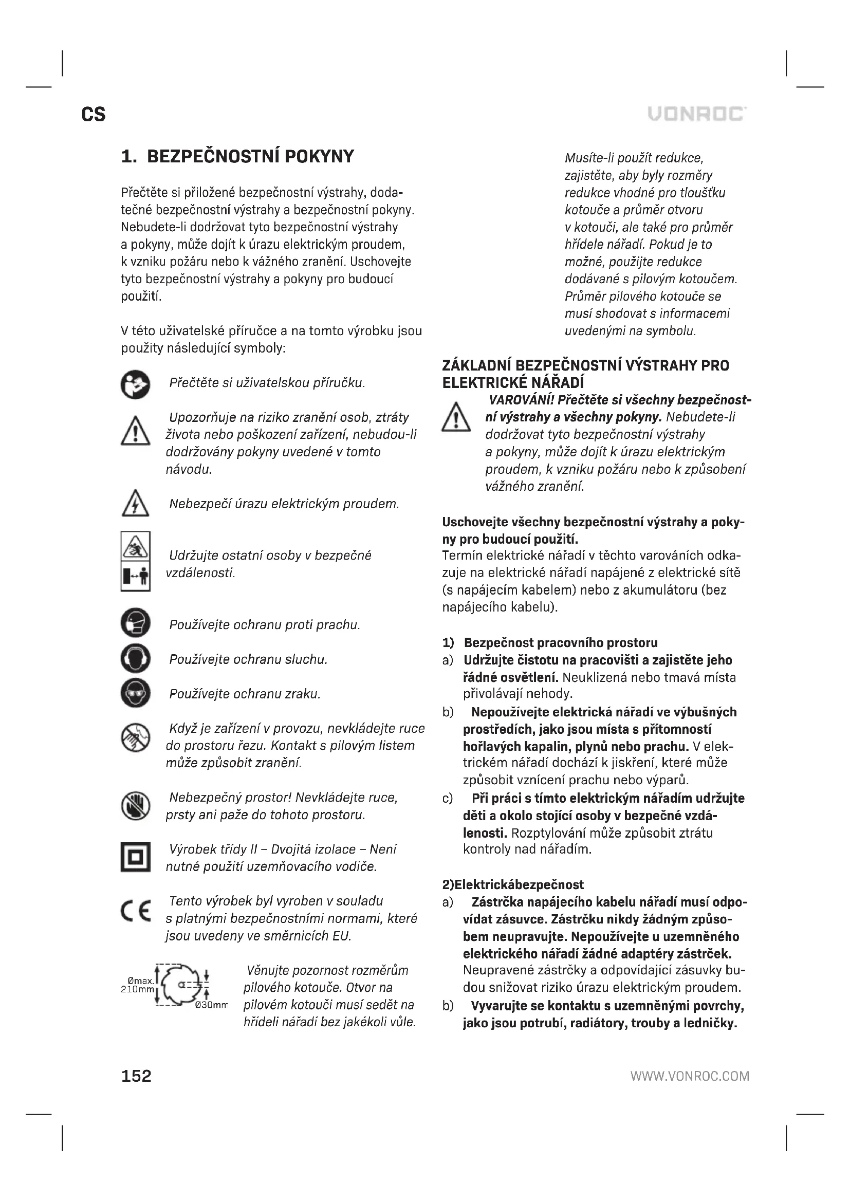 Přečtěte si přiložené bezpečnostní výstrahy, doda- tečné bezpečnostní výstrahy abezpečnostní pokyny. Nebudete-li dodržovat tyto bezpečnostní výstrahy apokyny, může dojít kúrazu elektrickým proudem, kvzniku požáru nebo kvážného zranění. Uschovejte tyto bezpečnostní výstrahy apokyny pro budoucí použití. Vtéto uživatelské příručce ana tomto výrobku jsou použity následující symboly: Přečtěte si uživatelskou příručku. Upozorňuje na riziko zranění osob, ztráty života nebo poškození zařízení, nebudou-li dodržovány pokyny uvedené vtomto návodu. Nebezpečí úrazu elektrickým proudem. Udržujte ostatní osoby vbezpečné vzdálenosti. Používejte ochranu proti prachu. Používejte ochranu sluchu. Používejte ochranu zraku. Když je zařízení vprovozu, nevkládejte ruce do prostoru řezu. Kontakt spilovým listem může způsobit zranění. Nebezpečný prostor! Nevkládejte ruce, prsty ani paže do tohoto prostoru. Výrobek třídy II – Dvojitá izolace – Není nutné použití uzemňovacího vodiče. Tento výrobek byl vyroben vsouladu splatnými bezpečnostními normami, které jsou uvedeny ve směrnicích EU. Ø30mm Ømax. 210mm Věnujte pozornost rozměrům pilového kotouče. Otvor na pilovém kotouči musí sedět na hřídeli nářadí bez jakékoli vůle. Musíte-li použít redukce, zajistěte, aby byly rozměry redukce vhodné pro tloušťku kotouče aprůměr otvoru vkotouči, ale také pro průměr hřídele nářadí. Pokud je to možné, použijte redukce dodávané spilovým kotoučem. Průměr pilového kotouče se musí shodovat sinformacemi uvedenými na symbolu. ZÁKLADNÍ BEZPEČNOSTNÍ VÝSTRAHY PRO