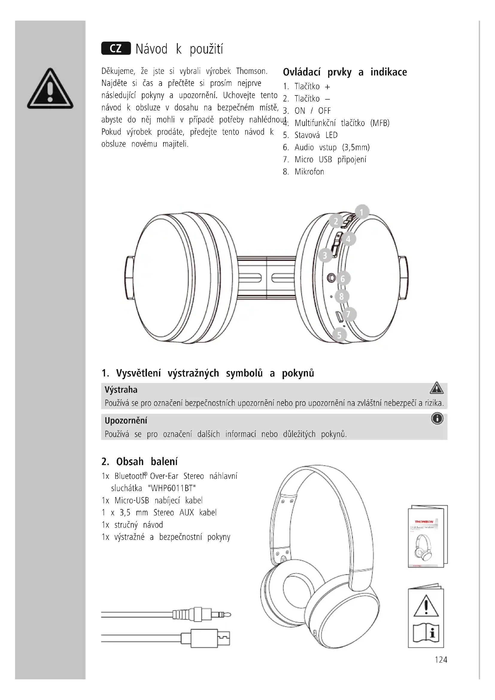 Με την παρούσα ο/η Hama GmbH & Co KG, δηλώνει ότι ο ραδιοεξοπλισμός [00132518] πληροί την οδηγία 2014/53/ΕΕ Το πλήρες κείμενο της δήλωσης συμμόρφωσης ΕΕ διατίθεται στην ακόλουθη ιστοσελίδα: wwwthomson-av-accessorieseu->00132518-> Downloads Ζώνη συχνοτήτων / Ζώνες συχνοτήτων 2402MHz – 2480MHz Μέγιστη εκπεμπόμενη ισχύς 263 dBm124 C Návod k použití Děkujeme, že jste si vybrali výrobek Thomson Najděte si čas a přečtěte si prosím nejprve následující pokyny a upozornění Uchovejte tento návod k obsluze v dosahu na bezpečném místě, abyste do něj mohli v případě potřeby nahlédnout Pokud výrobek prodáte, předejte tento návod k obsluze novému majiteli Ovládací prvky a indikace 1 Tlačítko + 2 Tlačítko − 3 ON / OFF 4 Multifunkční tlačítko (MFB) 5 Stavová LED 6 Audio vstup (3,5mm) 7 Micro USB připojení 8 Mikrofon