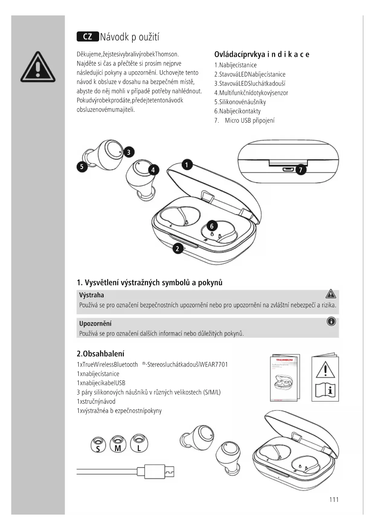 -Stereo sluchátka do uší WEAR 7701 1x nabíjecí stanice 1x nabíjecí kabel USB 3páry silikonových náušníků vrůzných velikostech (S/M/L) 1x stručný návod 1x výstražné abezpečnostní pokyny C Návod kpoužití True Wireless HeadphonesÉcouteurs True WirelessTrue Wireless náhlavní sluchátkaWEAR7701