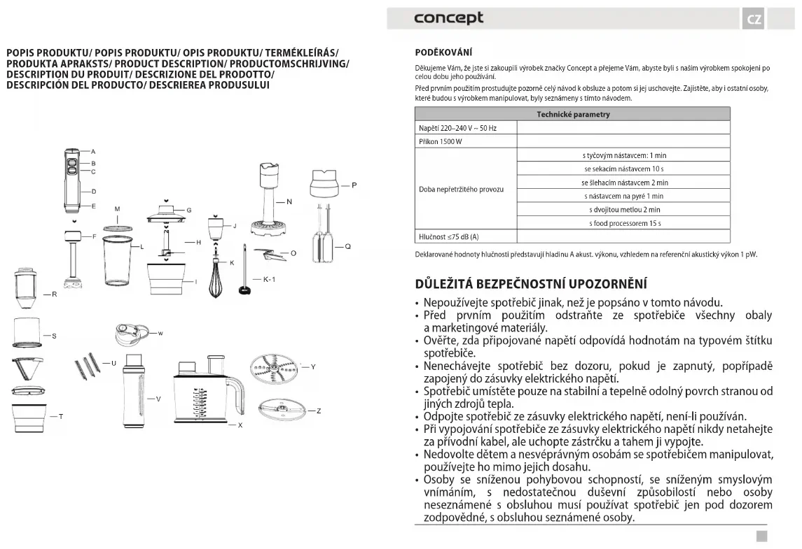 Děkujeme Vám, že jste si zakoupili výrobek značky Concept a přejeme Vám, abyste byli s naším výrobkem spokojeni po celou dobu jeho používání. Před prvním použitím prostudujte pozorně celý návod k obsluze a potom si jej uschovejte. Zajistěte, aby i ostatní osoby, které budou s výrobkem manipulovat, byly seznámeny s tímto návodem. Technické parametry Napětí 220–240 V ~ 50 Hz Příkon 1500 W Doba nepřetržitého provozu s tyčovým nástavcem: 1 min se sekacím nástavcem 10 s se šlehacím nástavcem 2 min s nástavcem na pyré 1 min s dvojitou metlou 2 min s food processorem 15 s Hlučnost ≤75 dB (A) Deklarované hodnoty hlučnosti představují hladinu A akust. výkonu, vzhledem na referenční akustický výkon 1 pW. DŮLEŽITÁ BEZPEČNOSTNÍ UPOZORNĚNÍ