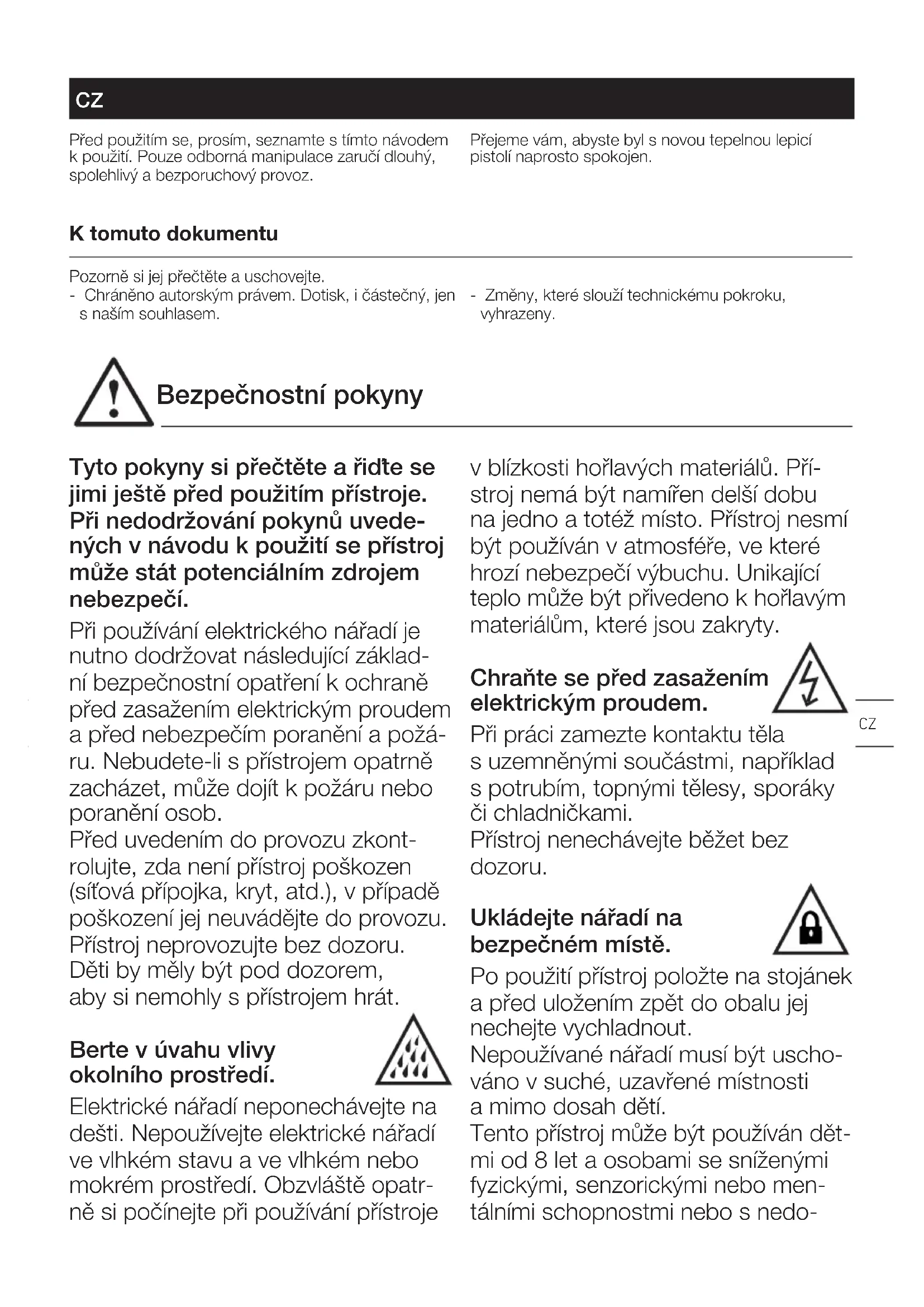 Bezpečnostní pokyny Před použitím se, prosím, seznamte stímto návodem kpoužití. Pouze odborná manipulace zaručí dlouhý, spolehlivý abezporuchový provoz. Přejeme vám, abyste byl s novou tepelnou lepicí pistolí naprosto spokojen. CZPřeklad originálního návodu kobsluze Ktomuto dokumentu Pozorně si jej přečtěte auschovejte. - Chráněno autorským právem. Dotisk, ičástečný, jen snaším souhlasem. - Změny, které slouží technickému pokroku, vyhrazeny. Tyto pokyny si přečtěte ařiďte se jimi ještě před použitím přístroje. Při nedodržování pokynů uvede- ných vnávodu kpoužití se přístroj může stát potenciálním zdrojem nebezpečí. Při používání elektrického nářadí je nutno dodržovat následující základ- ní bezpečnostní opatření kochraně před zasažením elektrickým proudem apřed nebezpečím poranění apožá- ru. Nebudete-li spřístrojem opatrně zacházet, může dojít kpožáru nebo poranění osob. Před uvedením do provozu zkont- rolujte, zda není přístroj poškozen (síťová přípojka, kryt, atd.), vpřípadě poškození jej neuvádějte do provozu. Přístroj neprovozujte bez dozoru. Děti by měly být pod dozorem, aby si nemohly spřístrojem hrát. Berte vúvahu vlivy okolního prostředí. Elektrické nářadí neponechávejte na dešti. Nepoužívejte elektrické nářadí ve vlhkém stavu ave vlhkém nebo mokrém prostředí. Obzvláště opatr- ně si počínejte při používání přístroje vblízkosti hořlavých materiálů. Pří- stroj nemá být namířen delší dobu na jedno atotéž místo. Přístroj nesmí být používán vatmosféře, ve které hrozí nebezpečí výbuchu. Unikající teplo může být přivedeno khořlavým materiálům, které jsou zakryty. Chraňte se před zasažením elektrickým proudem. Při práci zamezte kontaktu těla suzemněnými součástmi, například spotrubím, topnými tělesy, sporáky či chladničkami. Přístroj nenechávejte běžet bez dozoru. Ukládejte nářadí na bezpečném místě. Po použití přístroj položte na stojánek apřed uložením zpět do obalu jej nechejte vychladnout. Nepoužívané nářadí musí být uscho- váno vsuché, uzavřené místnosti amimo dosah dětí. Tento přístroj může být používán dět- mi od 8 let aosobami se sníženými fyzickými, senzorickými nebo men- tálními schopnostmi nebo snedo-
