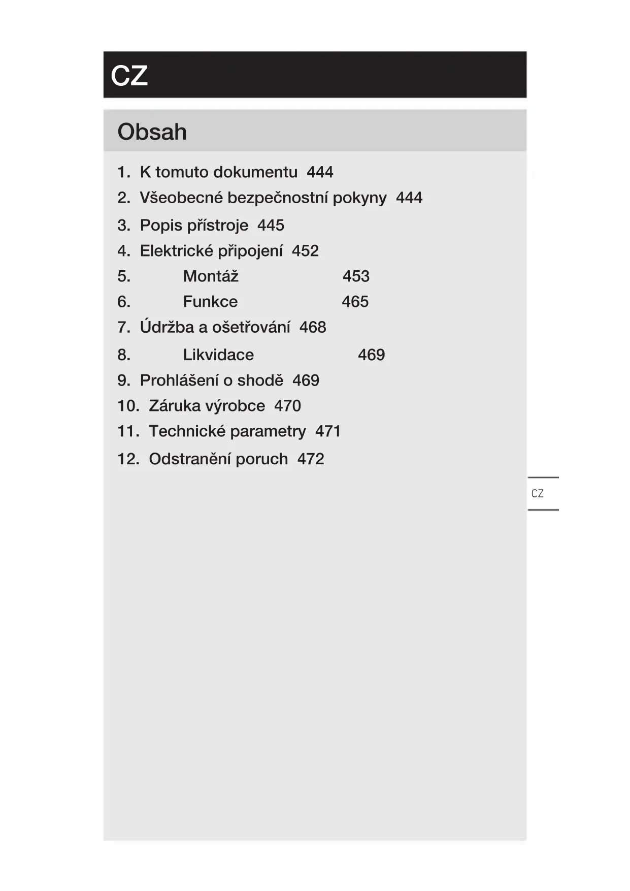 - Musí být stále přístupné. – Zacházení s elektrickým proudem může vést k nebez- pečným situacím. Při kontaktu s vodivými díly může dojít k úrazu elektrickým proudem, popáleninám nebo smrti. – Práce na síťovém napětí může provádět pouze kvalifiko- vaný personál. – Je třeba dodržovat předpisy pro instalaci elektrických zařízení a podmínky jejich připojení dle ČSN (např. D: VDE 0100, A:ÖVE-ÖNORM E8001-1, CH:SEV1000). – Používat jen originální náhradní díly. – Opravy mohou provádět jen specializované provozy.CZ – 445 – Obsah