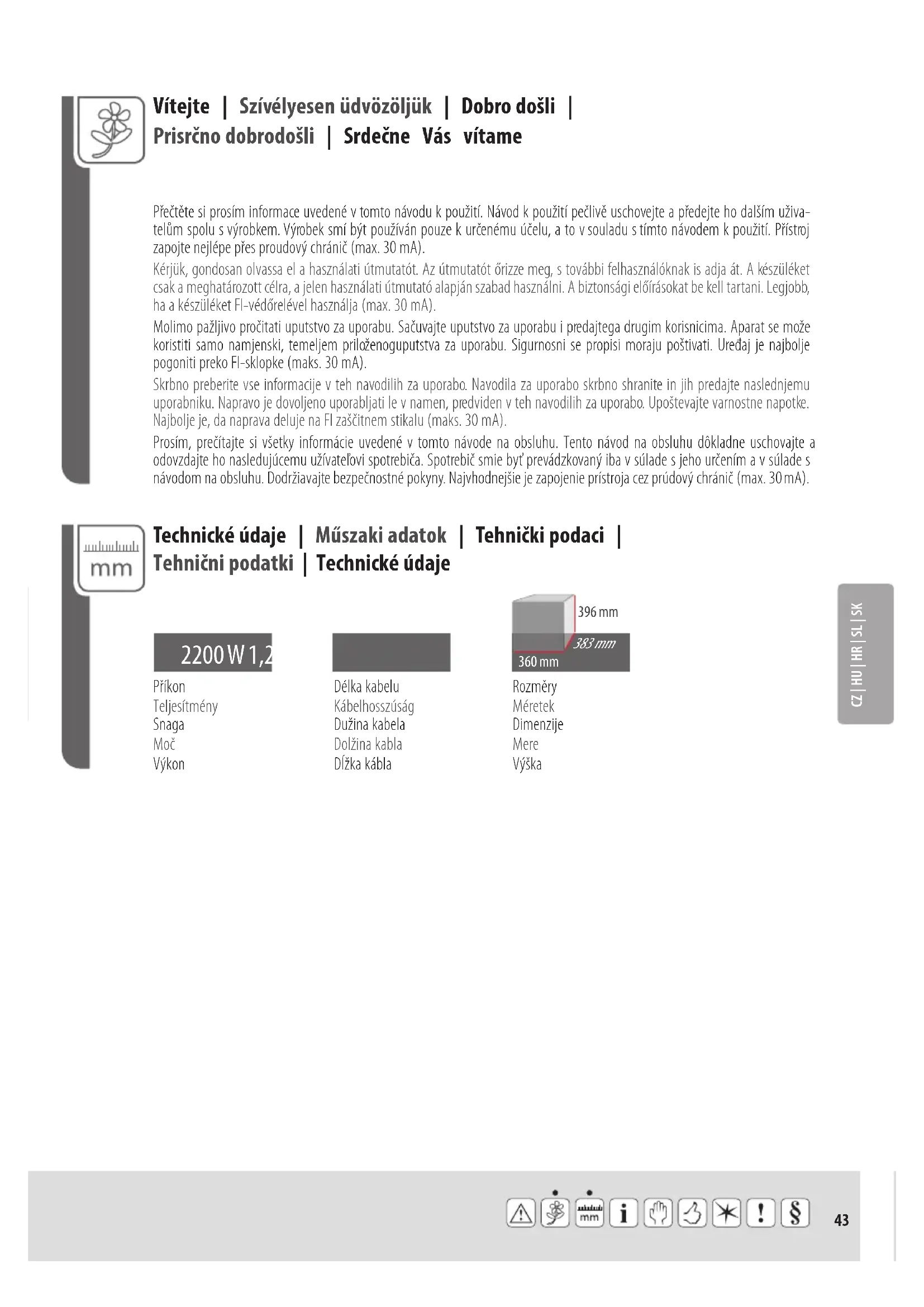 CZ | HU | HR | SL | SK Důležitá upozornění | Fontos tudnivalók | Važne upute | Pomembna opozorila | Dôležité upozornenia Nikdy nekrájejte na deskách kovovými předměty / noži. Vágáshoz ne használjon fémtárgyakat / késeket az öntött tálon. Metalnim predmetima / noževima nikada ne sjeći po lijevanim platama. Na platni na odlievanie nikdy nerežte kovovými predmetmi / nožmi. Po modelu nikoli ne režite s kovinskimi predmeti / noži. Před zahájením čištění vždy nejprve vytáhněte síťovou zástrčku z elektrické zásuvky a nechte přístroj vychladnout. Nepoužívejte žádná rozpouštědla.