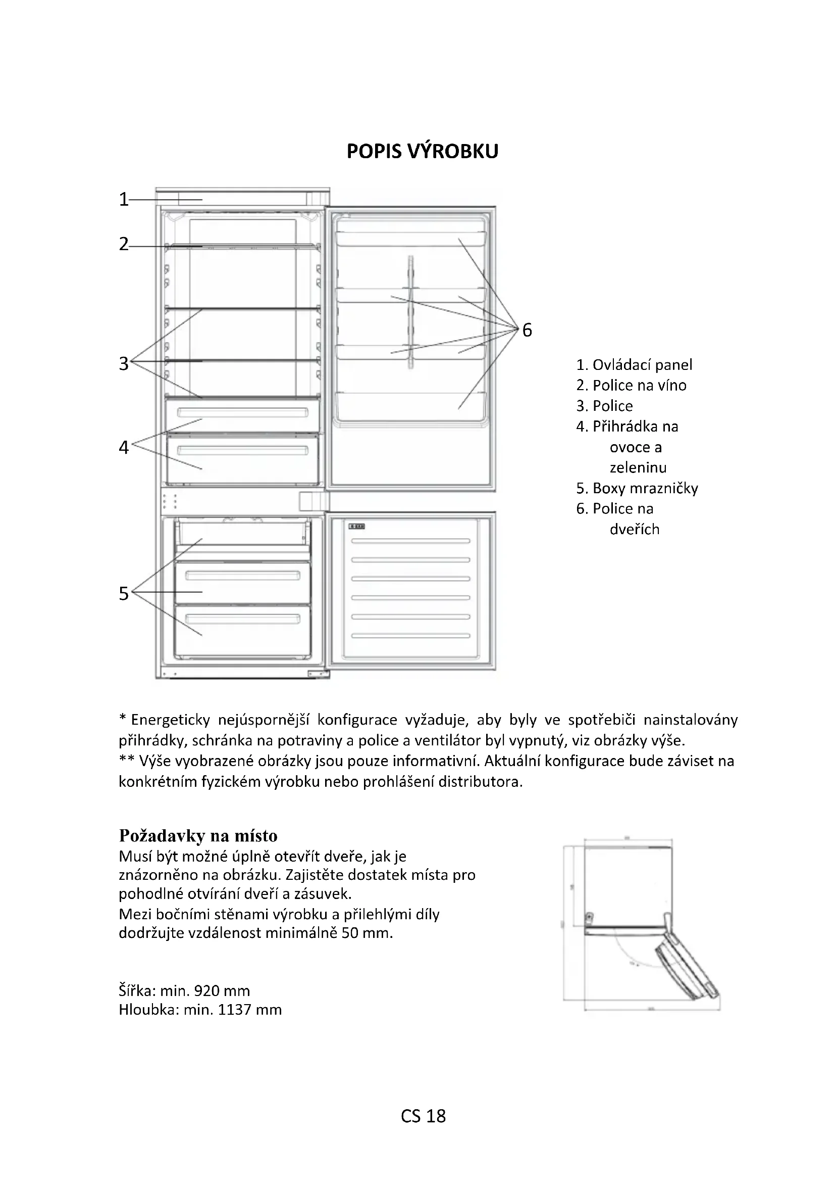 - Energeticky nejúspornější konfigurace vyžaduje, aby byly ve spotřebiči nainstalovány přihrádky, schránka na potraviny a police a ventilátor byl vypnutý, viz obrázky výše. ** Výše vyobrazené obrázky jsou pouze informativní. Aktuální konfigurace bude záviset na konkrétním fyzickém výrobku nebo prohlášení distributora. Požadavky na místo Musí být možné úplně otevřít dveře, jak je znázorněno na obrázku. Zajistěte dostatek místa pro pohodlné otvírání dveří a zásuvek. Mezi bočními stěnami výrobku a přilehlými díly dodržujte vzdálenost minimálně 50 mm. Šířka: min. 920 mm Hloubka: min. 1137 mm