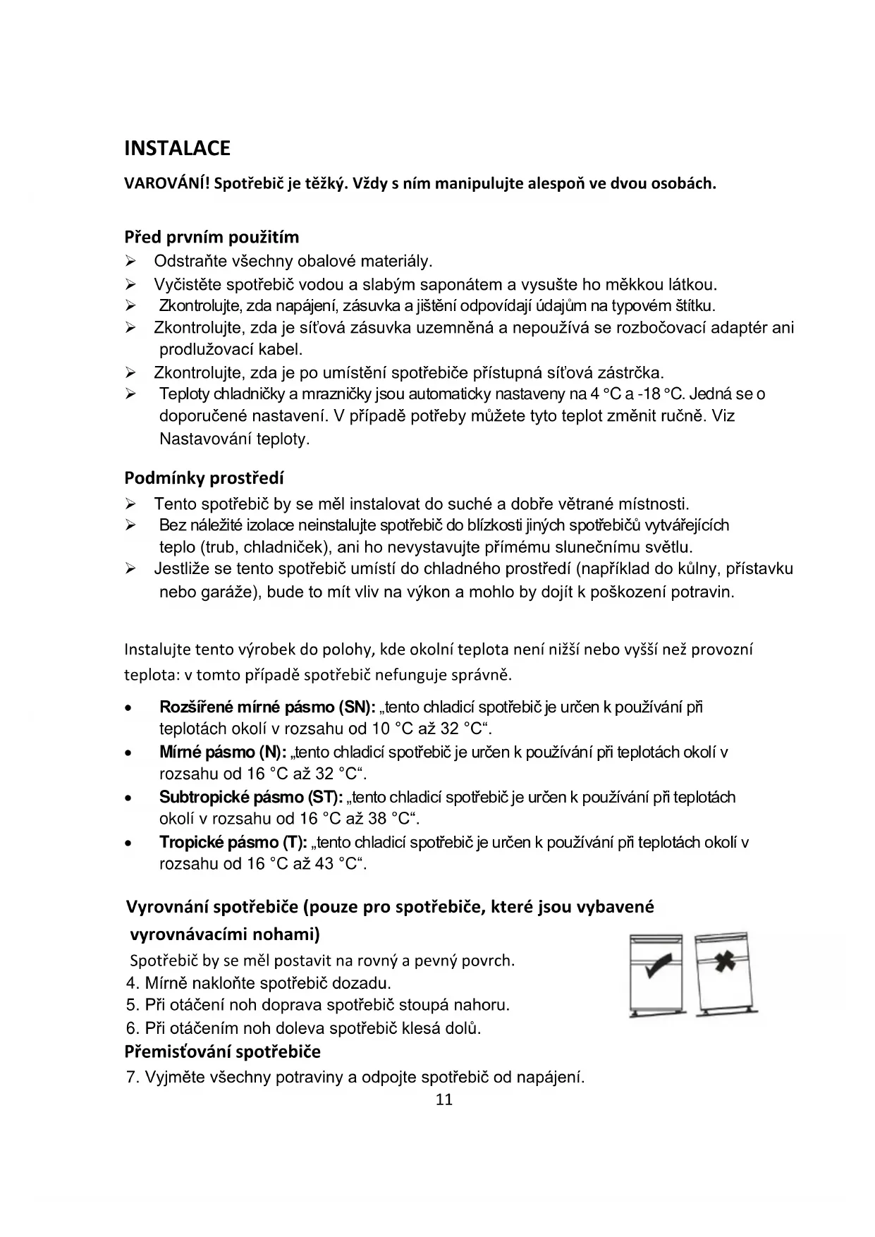 - Tropické pásmo (T): „tento chladicí spotřebič je určen k používání při teplotách okolí v rozsahu od 16 °C až 43 °C“. Vyrovnání spotřebiče (pouze pro spotřebiče, které jsou vybavené vyrovnávacími nohami) Spotřebič by se měl postavit na rovný a pevný povrch.