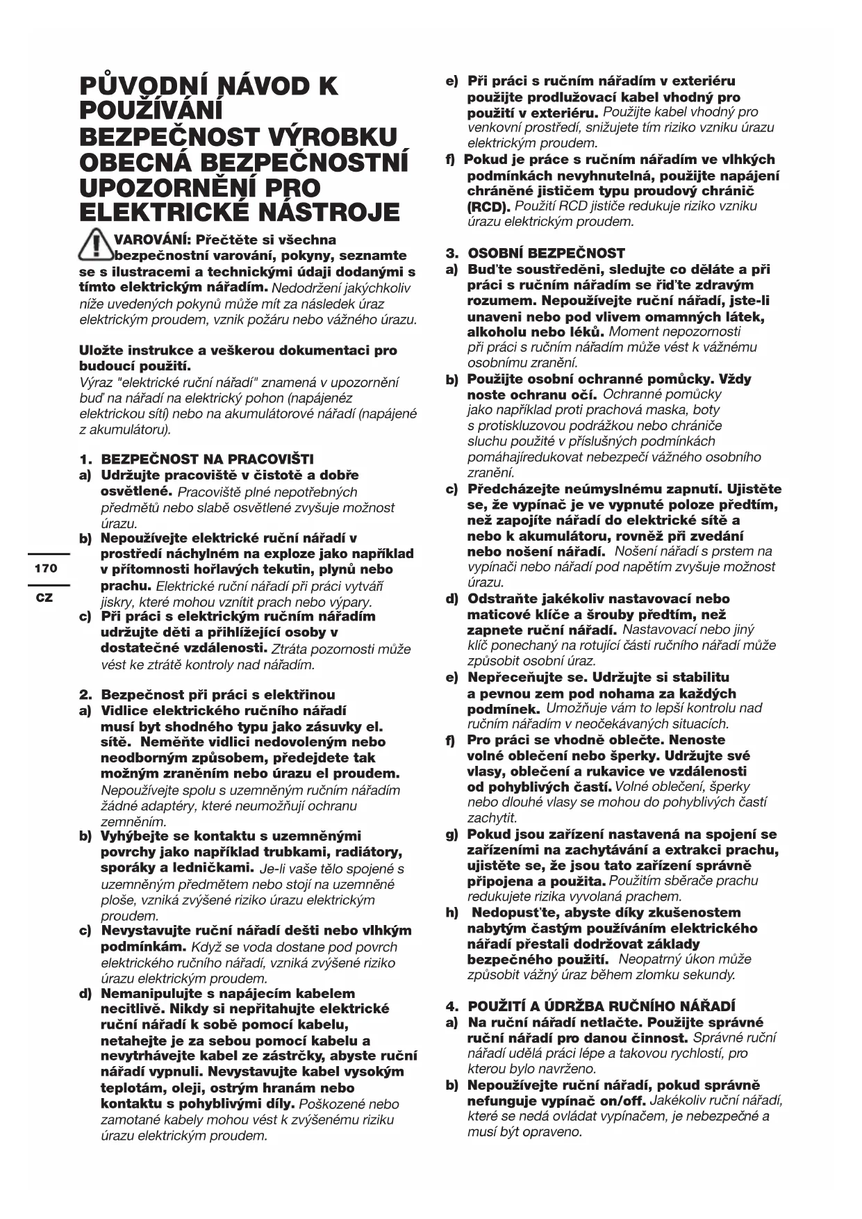 VAROVÁNÍ: Přečtěte si všechna bezpečnostní varování, pokyny, seznamte se s ilustracemi a technickými údaji dodanými s tímto elektrickým nářadím. Nedodržení jakýchkoliv níže uvedených pokynů může mít za následek úraz elektrickým proudem, vznik požáru nebo vážného úrazu. Uložte instrukce a veškerou dokumentaci pro budoucí použití. Výraz "elektrické ruční nářadí" znamená v upozornění buď na nářadí na elektrický pohon (napájenéz elektrickou sítí) nebo na akumulátorové nářadí (napájené z akumulátoru).