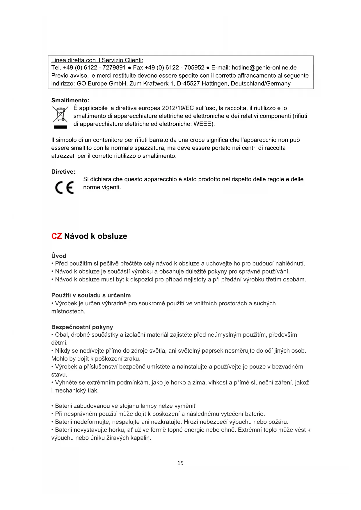 - Lampa musí být postavena tak, aby nemohlo dojít ke zranění osob pádem, zakopnutím atp. Zapnutí/vypnutí a nastavení jasu Zapnutí, vypnutí a nastavení jasu se provádí přes dotykové pole. Pro zapnutí/vypnutí světla se krátce dotkněte dotykové plochy senzoru. Dotkněte se a podržte dotykovou plochu senzoru, pokud chcete zvýšit nebo snížit jas.17 Záruční reklamace V případě, že zařízení navzdory očekáváním nebude správně fungovat, mějte prosím na paměti: Záruční doba je platná 3 roky od data jeho zakoupení a podléhá správnému používání. Ponechejte si doklad o zakoupení a jeho původní balení. Doklad o koupi slouží jako důkaz data nákupu zařízení pro vyřízení reklamace. Tato záruka se vztahuje jenom na materiál nebo výrobní vady, ale nevztahuje se na poškození křehkých částí, jako je například kryt. Zárukou nejsou kryty defekty zařízení způsobené nesprávným používáním nad rámec obecných pokynů pro užívání. Záruka zaniká, jestliže byly opravy provedeny bez explicitního souhlasu našeho týmu zákaznického servisu. Záruční opravy mohou být realizovány jenom po doložení dokladu o zakoupení – veškeré součásti, které byly vráceny musí být vždy nahlášeny telefonicky! Veškeré součásti musí být vráceny spolu s dostatečným poštovným a relevantním číslem vrácení součásti. Uveďte, prosím, vaše jméno, adresu, poštovní směrovací číslo, město, telefonní číslo (spolu s předvolbou) a vaše důvody stížnosti. Děkujeme za vaše pochopení!