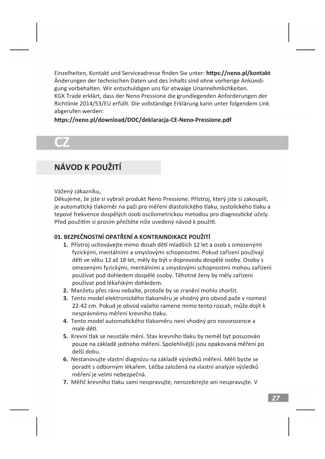 Pokud se vyskytnou problémy s provozem přístroje za běžných podmínek, obraťte se na autorizované servisní středisko nebo distributora společnos Neno. Pro případ opravy si uschovejte záruční list. Na výrobek se vztahuje záruka 24 měsíců. Záruční podmínky naleznete na adrese: hps://neno.pl/gwarancja. Podrobnos, kontaktní údaje a adresu pro poskytování služeb naleznete na adrese: hps://neno.pl/kontakt. Specikace a obsah se mohou změnit bez předchozího upozornění. Omlouváme se za případné nepříjemnos. KGK Trade prohlašuje, že Neno Pressione splňuje základní požadavky směrnice 2014/53/EU. Úplné znění prohlášení naleznete na následujícím odkazu: hps://neno.pl/download/DOC/deklaracja-CE-Neno-Pressione.pdf.34