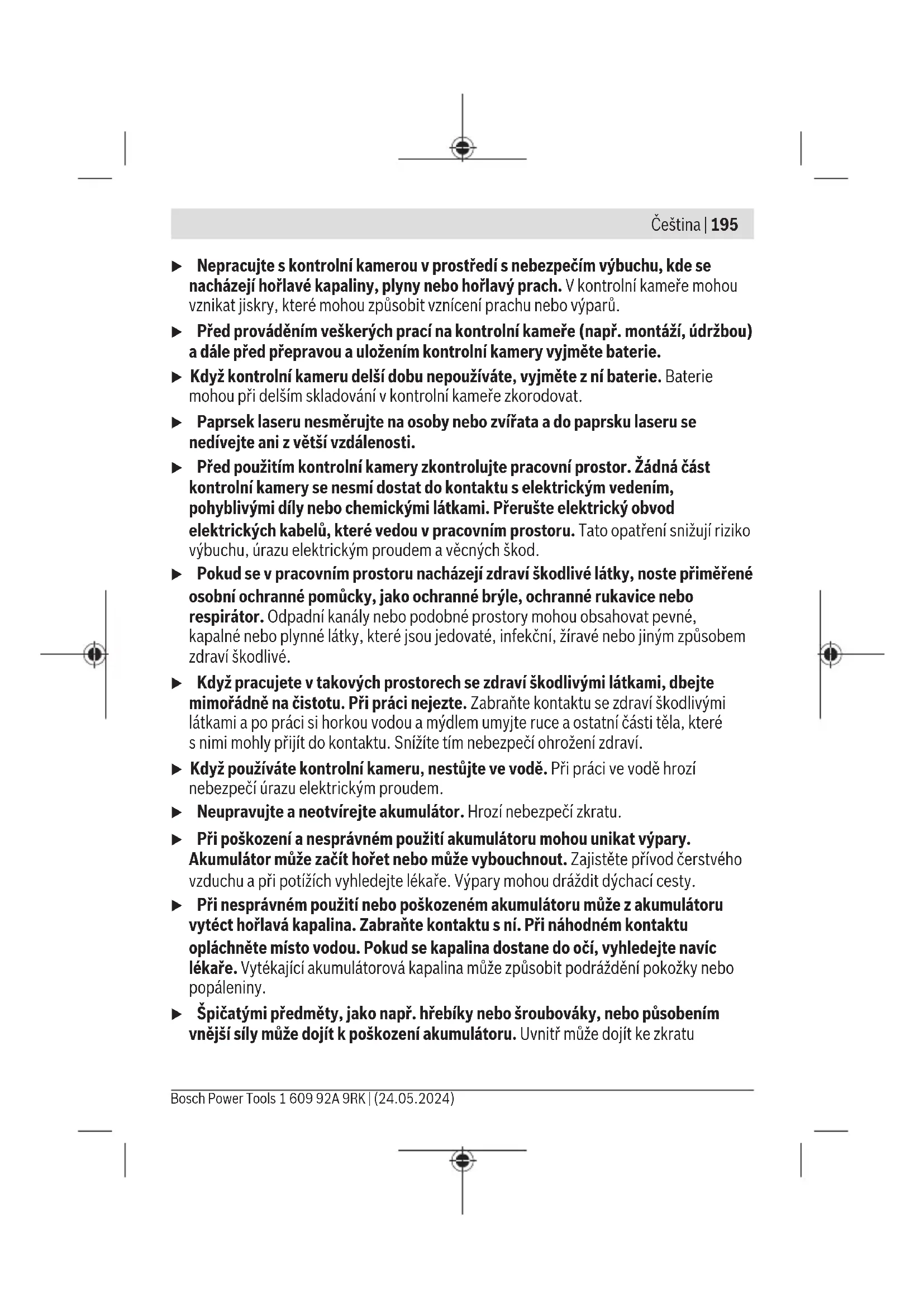 - <Vypnout za…>: Zvolte časový interval, po kterém se kontrolní kamera automaticky vypne, když nestisknete žádné tlačítko. – <Informace opřístroji>: Zde najdete informace opřístroji, jako například nainstalovanou verzi softwaru aprávní informace. – <Výrobní nastavení>: Všechny možnosti nabídky můžete resetovat na nastavení zvýroby. Zároveň se definitivně vymažou všechny uložené soubory. Uložení/přenos snímků Pořízení fotografie Stiskněte tlačítko pořízení fotografie(12) pro pořízení fotografie aktuálního zobrazení na displeji. Fotografie se ukládají do interní paměti kontrolní kamery alze je přenést přes rozhraní USBType‑C®. Přenos dat přes rozhraní USBType-C® Pro přenos dat přes rozhraní USBType‑C® zapněte kontrolní kameru. Otevřete kryt zdířky USBType-C®(17). Propojte zdířku USBType‑C® pomocí kabelu USBType‑C®(18) spočítačem. Bosch Power Tools 1 609 92A 9RK | (24.05.2024)204 | Čeština Na počítači otevřete prohlížeč souborů azvolte jednotkuBosch_GIC. Uložené soubory lze zinterní paměti kontrolní kamery zkopírovat, přesunout do počítače nebo vymazat. Po dokončení požadovaného procesu jednotku standardně odpojte. Upozornění: Jednotku vždy nejprve odpojte od operačního systému počítače (vysunout jednotku), protože jinak se může poškodit interní paměť kontrolní kamery. Odpojte kabel USBType-C® (kontrolní kamera se přitom automaticky vypne). Kvůli ochraně před prachem astříkající vodou zavřete kryt(16). Upozornění: Kontrolní kameru připojujte přes rozhraní USBType-C® výhradně kpočítači. Při připojení kjiným zařízením se může kontrolní kamera poškodit. Upozornění: Rozhraní USBType-C® slouží výhradně pro přenos dat, nelze přes něj nabíjet akumulátory nebo jiná zařízení. Pracovní pokyny Zkontrolujte prostor, který chcete prohlížet, avšímejte si zejména překážek nebo nebezpečných míst. Ohněte kabel kamery(1) tak, aby bylo možné hlavu kamery dobře zavést do kontrolovaného prostoru. Opatrně zaveďte kabel kamery. Přizpůsobte jas světla kamery(3) tak, aby byl obraz dobře viditelný. Při silně odrazivých předmětech můžete dosáhnout lepšího obrazu pomocí méně světla nebo nastavením černobílého kontrastu. Pokud nejsou zkoumané předměty zobrazené ostře, zmenšete nebo zvětšete vzdálenost mezi hlavou kamery(2) apředmětem. Závady – příčiny aodstranění Chybový ukazatel na displeji Příčina Odstranění (žluté varování) Interní paměť téměř plná Vymažte soubory zinterní paměti. (červené varování) Plná interní paměť Vymažte soubory zinterní paměti. Chyba interní paměti Kontrolní kameru spusťte znovu. Pokud problém přetrvává, obraťte se na autorizovaný servisBosch. 1 609 92A 9RK | (24.05.2024) Bosch Power ToolsČeština | 205 Údržba aservis Údržba ačištění Ruční přístroj(13) neponořujte do vody nebo jiných kapalin. Kontrolní kameru vždy udržujte včistotě. Kontrolní kameru avšechny pomůcky důkladně vyčistěte zejména poté, když jste pracovali vprostorech se zdraví škodlivými látkami. Nečistoty otřete vlhkým, měkkým hadříkem. Nepoužívejte čisticí prostředky nebo rozpouštědla. Pravidelně čistěte zejména čočku kamery(4) adávejte přitom pozor na vlákna. Výměna integrované knoflíkové baterie Výměnu knoflíkové baterie musí provést firma Bosch nebo autorizovaný servis pro elektrické nářadí Bosch. u Pozor: Knoflíkovou baterii vyměňujte vždy za knoflíkovou baterii stejného typu. Hrozí nebezpečí výbuchu. u Vybité knoflíkové baterie vyjměte ařádně zlikvidujte. Vybité knoflíkové baterie mohou přestat těsnit, atím může dojít kpoškození výrobku nebo poranění osob. Zákaznická služba aporadenství ohledně použití Zákaznická služba zodpoví vaše dotazy kopravě aúdržbě vašeho výrobku atéž knáhradním dílům. Rozkladové výkresy ainformace onáhradních dílech najdete také na: www.bosch-pt.com Vpřípadě dotazů knašim výrobkům apříslušenství vám ochotně pomůže poradenský tým Bosch. Vpřípadě veškerých otázek aobjednávek náhradních dílů bezpodmínečně uveďte 10místné věcné číslo podle typového štítku výrobku. Czech Republic Robert Bosch odbytová s.r.o. Bosch Service Center PT K Vápence 1621/16 692 01 Mikulov Na www.bosch-pt.cz si si můžete objednat opravu Vašeho stroje nebo náhradní díly online. Tel.: +420 519 305700 Fax: +420 519 305705 E-Mail: servis.naradi@cz.bosch.com www.bosch-pt.cz Bosch Power Tools 1 609 92A 9RK | (24.05.2024)206 | Čeština Další adresy servisů najdete na: www.bosch-pt.com/serviceaddresses Přeprava Doporučené lithium-iontové akumulátory podléhají požadavkům zákona onebezpečných nákladech. Tyto akumulátory mohou být bez dalších podmínek přepravovány uživatelem po silnici. Při zasílání prostřednictvím třetí osoby (např.: letecká přeprava nebo spedice) je třeba brát zřetel na zvláštní požadavky na balení aoznačení. Zde musí být při přípravě zásilky nezbytně přizván expert na nebezpečné náklady. Akumulátory zasílejte pouze tehdy, pokud není poškozený kryt. Otevřené kontakty přelepte lepicí páskou aakumulátor zabalte tak, aby se vobalu nemohl pohybovat. Dodržujte také případné další národní předpisy. Likvidace Kontrolní kameru, baterie/akumulátory, příslušenství aobaly je třeba odevzdat kekologické recyklaci. Kontrolní kameru abaterie/akumulátory nevyhazujte do domovního odpadu! Pouze pro zeměEU: Podle evropské směrnice 2012/19/EU se musí již nepoužitelné kontrolní kamery apodle evropské směrnice 2006/66/ES vadné nebo opotřebované akumulátory/baterie shromažďovat odděleně aodevzdat kekologické recyklaci. Při nesprávné likvidaci mohou odpadní ele