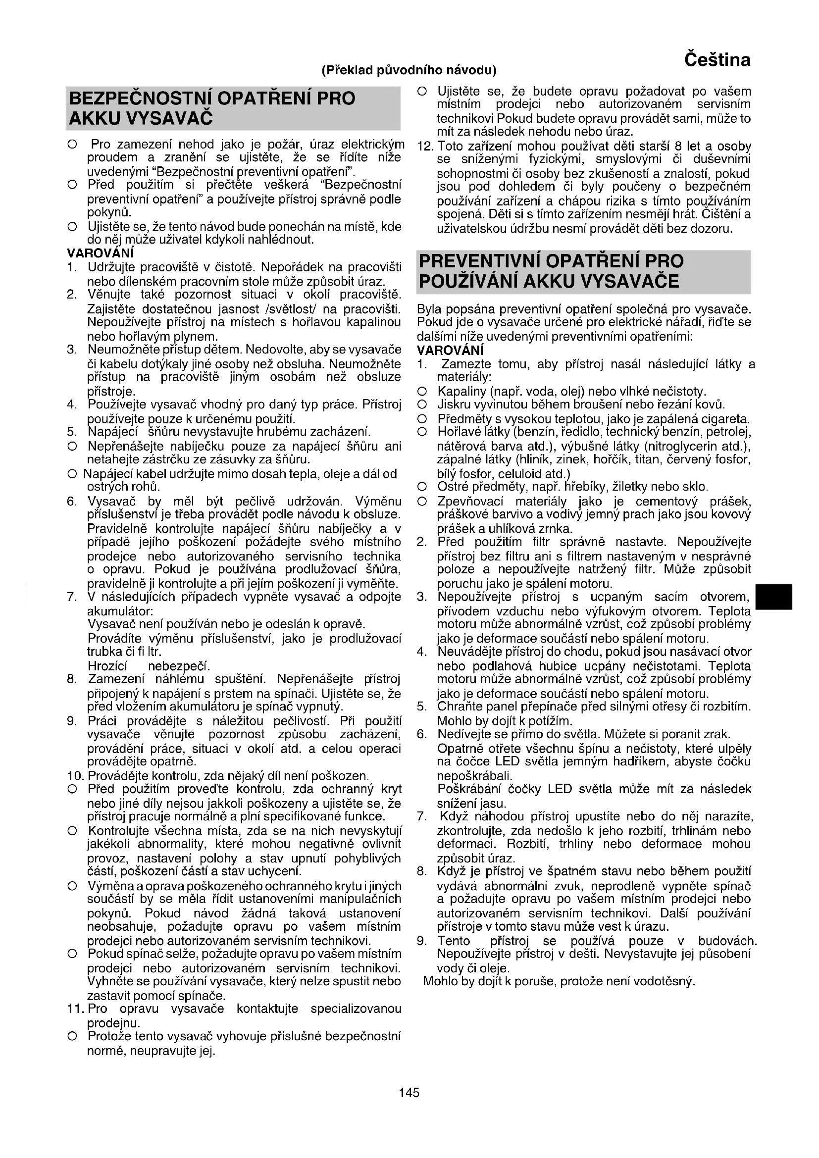 Byla popsána preventivní opatření společná pro vysavače. Pokud jde o vysavače určené pro elektrické nářadí, řiďte se dalšími níže uvedenými preventivními opatřeními: VAROVÁNÍ