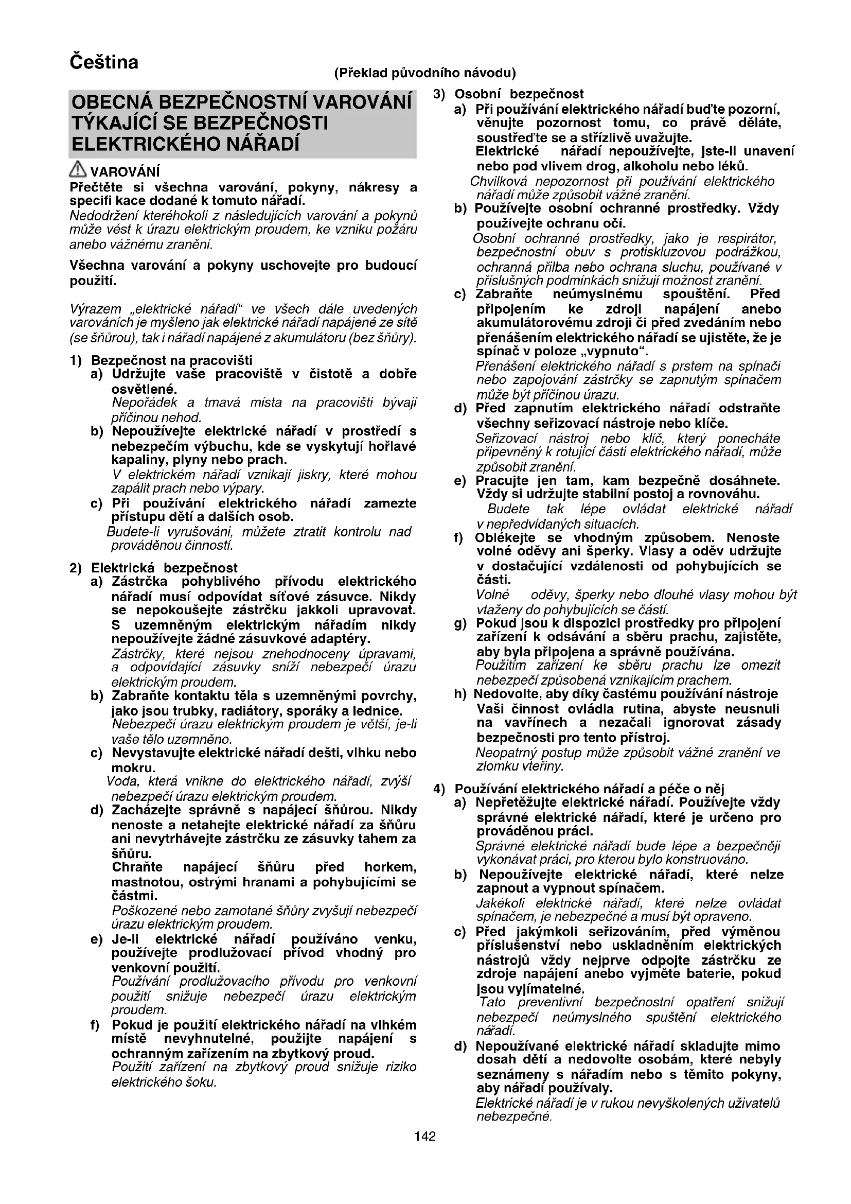 VAROVÁNÍ Přečtěte si všechna varování, pokyny, nákresy a specifi kace dodané k tomuto nářadí. Nedodržení kteréhokoli z následujících varování a pokynů může vést k úrazu elektrickým proudem, ke vzniku požáru anebo vážnému zranění. Všechna varování a pokyny uschovejte pro budoucí použití. Výrazem „elektrické nářadí“ ve všech dále uvedených varováních je myšleno jak elektrické nářadí napájené ze sítě (se šňůrou), tak i nářadí napájené z akumulátoru (bez šňůry).