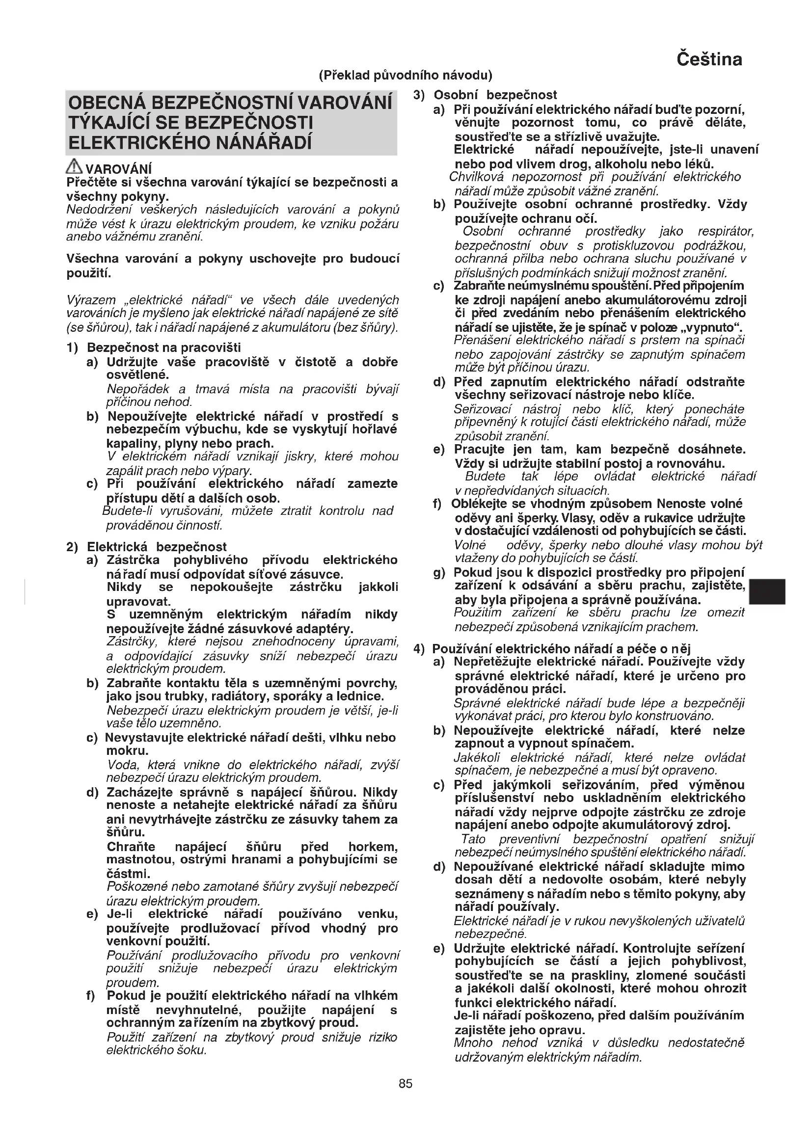 VAROVÁNÍ Přečtěte si všechna varování týkající se bezpečnosti a všechny pokyny. Nedodržení veškerých následujících varování a pokynů může vést k úrazu elektrickým proudem, ke vzniku požáru anebo vážnému zranění. Všechna varování a pokyny uschovejte pro budoucí použití. Výrazem „elektrické nářadí“ ve všech dále uvedených varováních je myšleno jak elektrické nářadí napájené ze sítě (se šňůrou), tak i nářadí napájené z akumulátoru (bez šňůry).