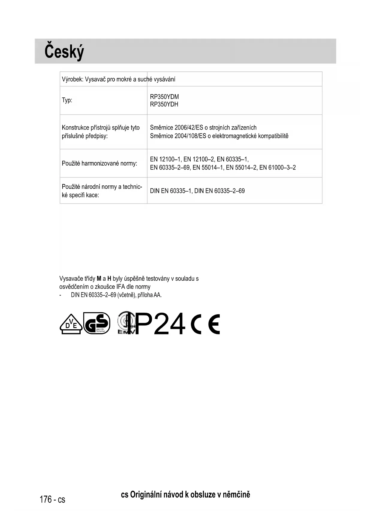 POZNÁMKA: Dodatečně je třeba u vysavačů třídy H minimálně jednou ročně zkontrolovat účinnost vysavače. V místnosti musí být k dispozici dostatečné odvětrání L, vrací-li se odpadní vzduch zpět do místnosti. Další pokyny najdete v národních předpisech. Klesá-li sací výkon vysavače a nezvýší-li sací výkon ani vyčištění kazet se skládaným fi ltrem (za předpokladu, že je zásobník prázdný Rounový fi ltrační sáček vyměněný), je nutné kazety se skládaným fi ltrem vyměnit (viz stručný návod a odstavec 7.1).