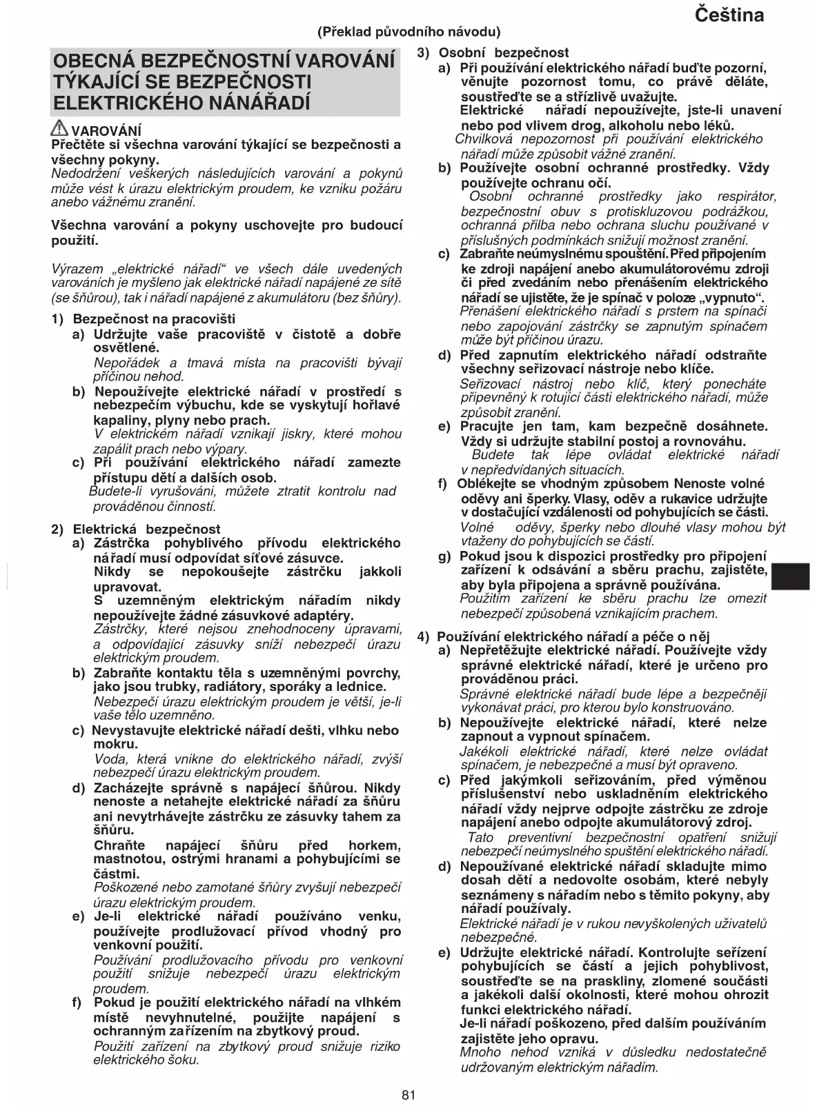 VAROVÁNÍ Přečtěte si všechna varování týkající se bezpečnosti a všechny pokyny. Nedodržení veškerých následujících varování a pokynů může vést k úrazu elektrickým proudem, ke vzniku požáru anebo vážnému zranění. Všechna varování a pokyny uschovejte pro budoucí použití. Výrazem „elektrické nářadí“ ve všech dále uvedených varováních je myšleno jak elektrické nářadí napájené ze sítě (se šňůrou), tak i nářadí napájené z akumulátoru (bez šňůry).