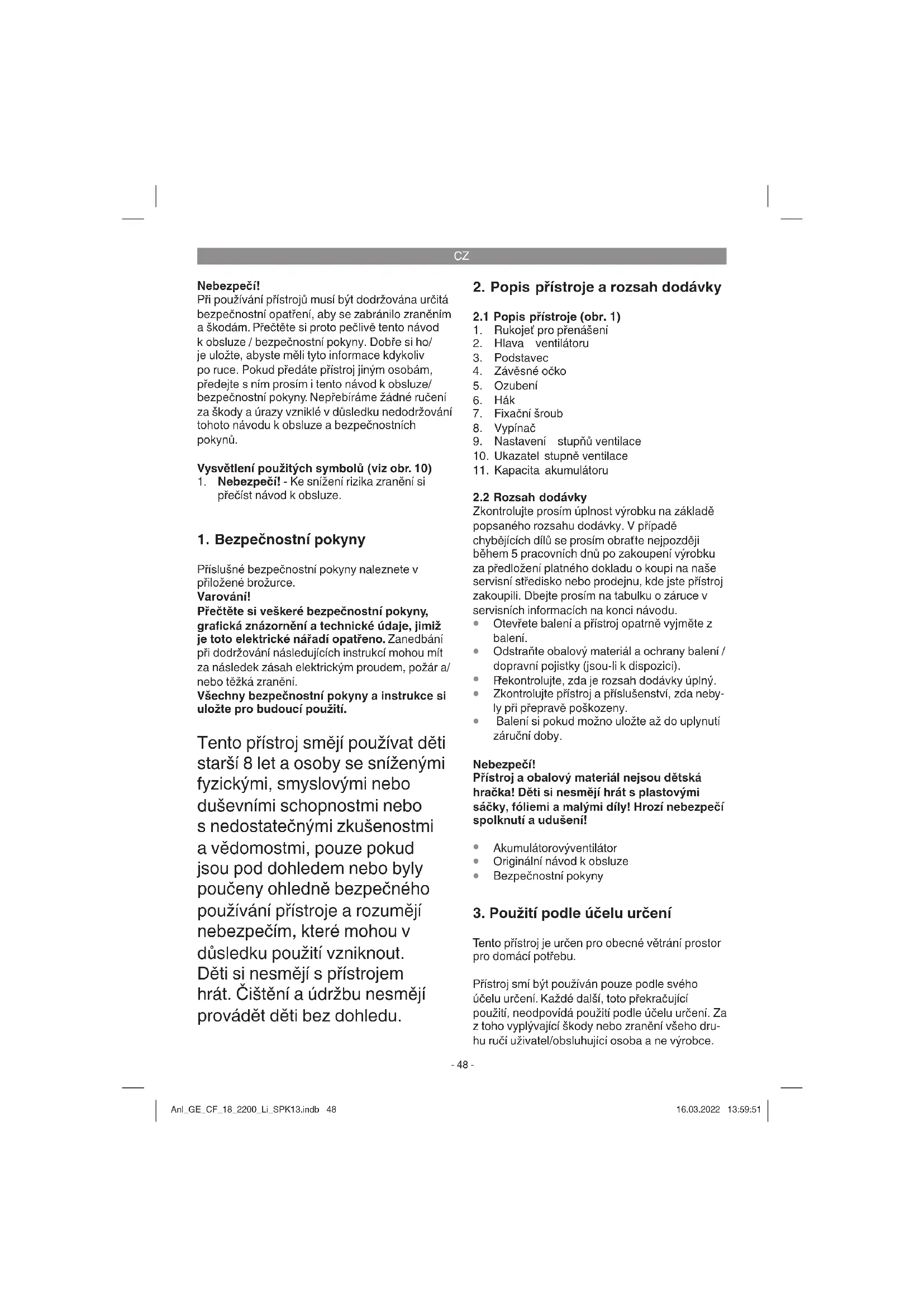 Tento přístroj je určen pro obecné větrání prostor pro domácí potřebu. Přístroj smí být používán pouze podle svého účelu určení. Každé další, toto překračující použití, neodpovídá použití podle účelu určení. Za z toho vyplývající škody nebo zranění všeho dru- hu ručí uživatel/obsluhující osoba a ne výrobce. Anl_GE_CF_18_2200_Li_SPK13.indb 48Anl_GE_CF_18_2200_Li_SPK13.indb 48 16.03.2022 13:59:5116.03.2022 13:59:51CZ