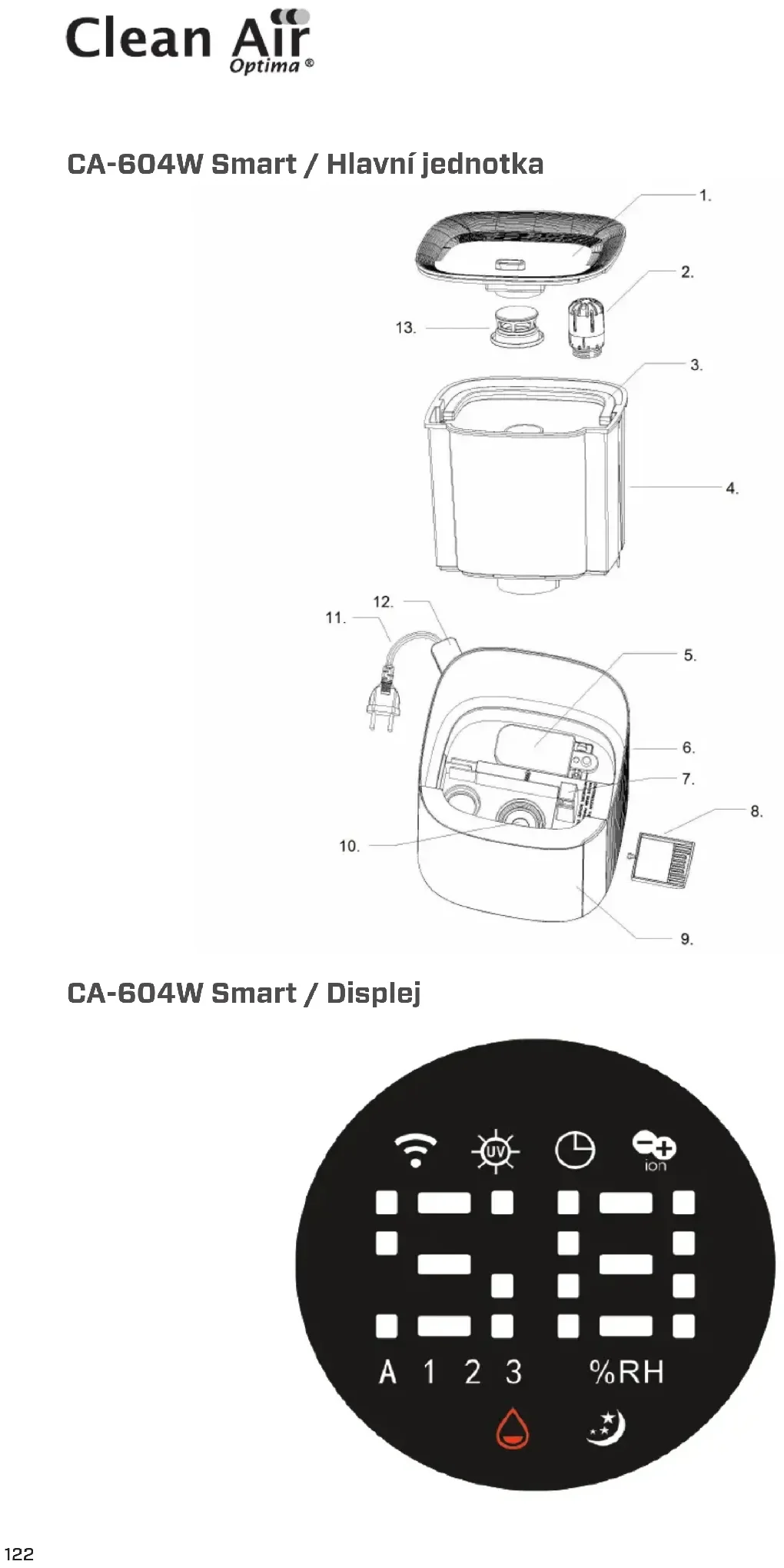 CA-604W Smart / Displej123 Čeština Děkujeme Vám, že jste zakoupili ultrazvukový zvlhčovač vzduchu Clean Air Optima® CA-604W Smart. Přejeme Vám, aby Vám tento účinný a efektivní výrobek po mnoho let sloužil jako zdroj zdravého vzduchu uvnitř budov. Tento návod popisuje bezpečnostní opatření, která je třeba při provozu tohoto zařízení dodržovat. Jejich cílem je prevence úrazů a poškození zařízení. Popis zařízení Zařízení sestává z následujících hlavních součástí: