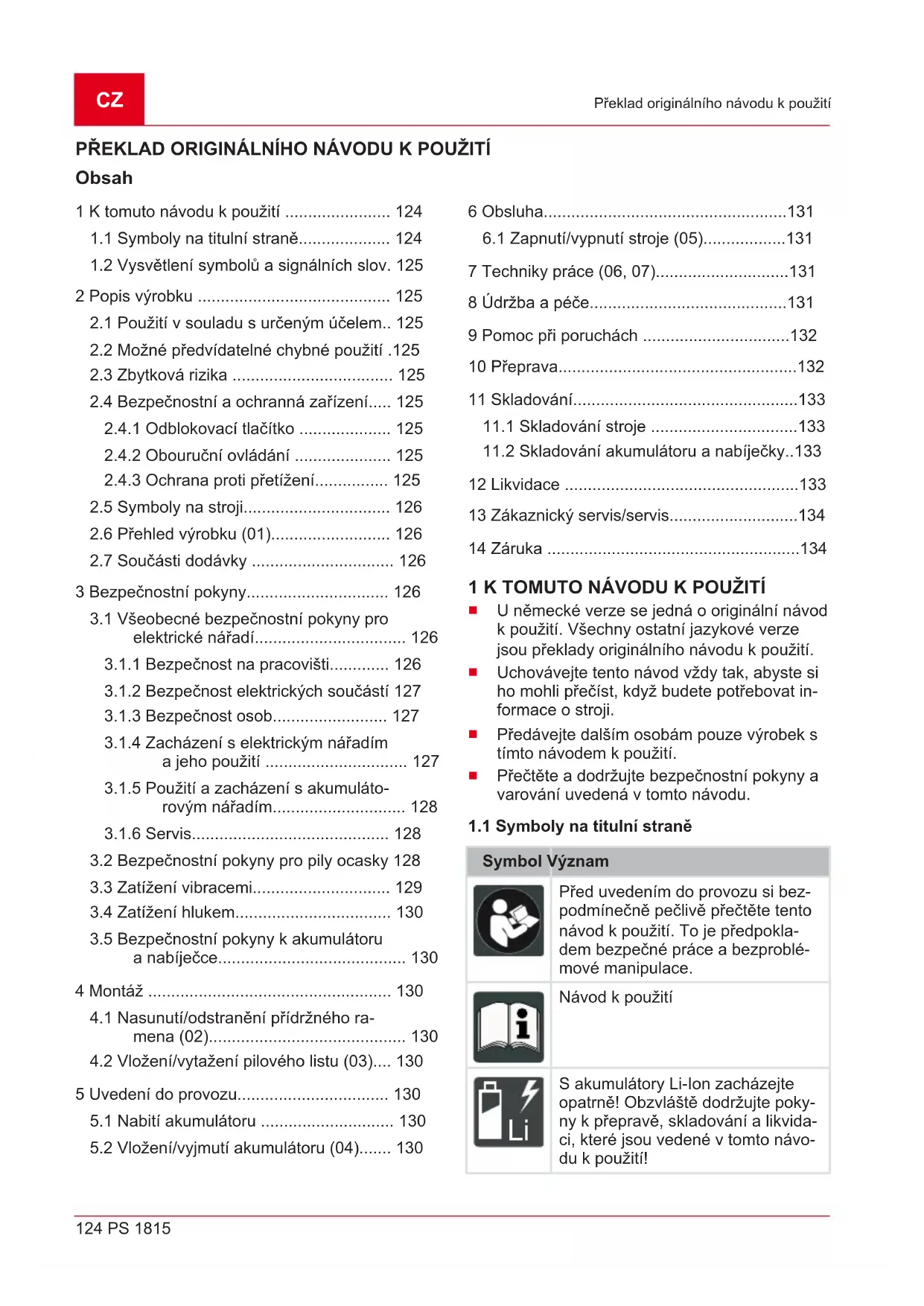Stroj je vybaven ochranou proti přetížení, která ho při přetížení vypne (např. u sevřeného pilové- ho listu). Po krátkém ochlazení je možné stroj opět za- pnout.CZ 126 PS 1815 Bezpečnostní pokyny
