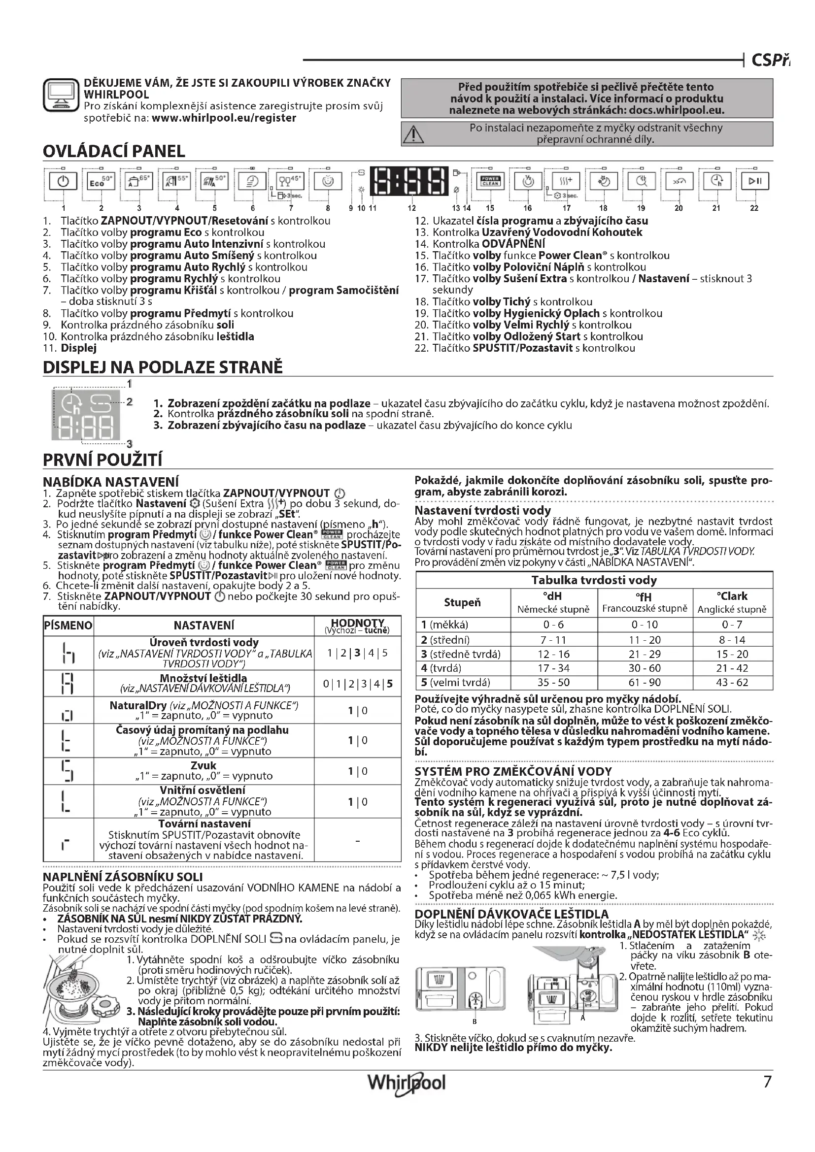 Před použitím spotřebiče si pečlivě přečtěte tento návod k použití a instalaci. Více informací o produktu naleznete na webových stránkách: docs.whirlpool.eu. Po instalaci nezapomeňte z myčky odstranit všechny přepravní ochranné díly.