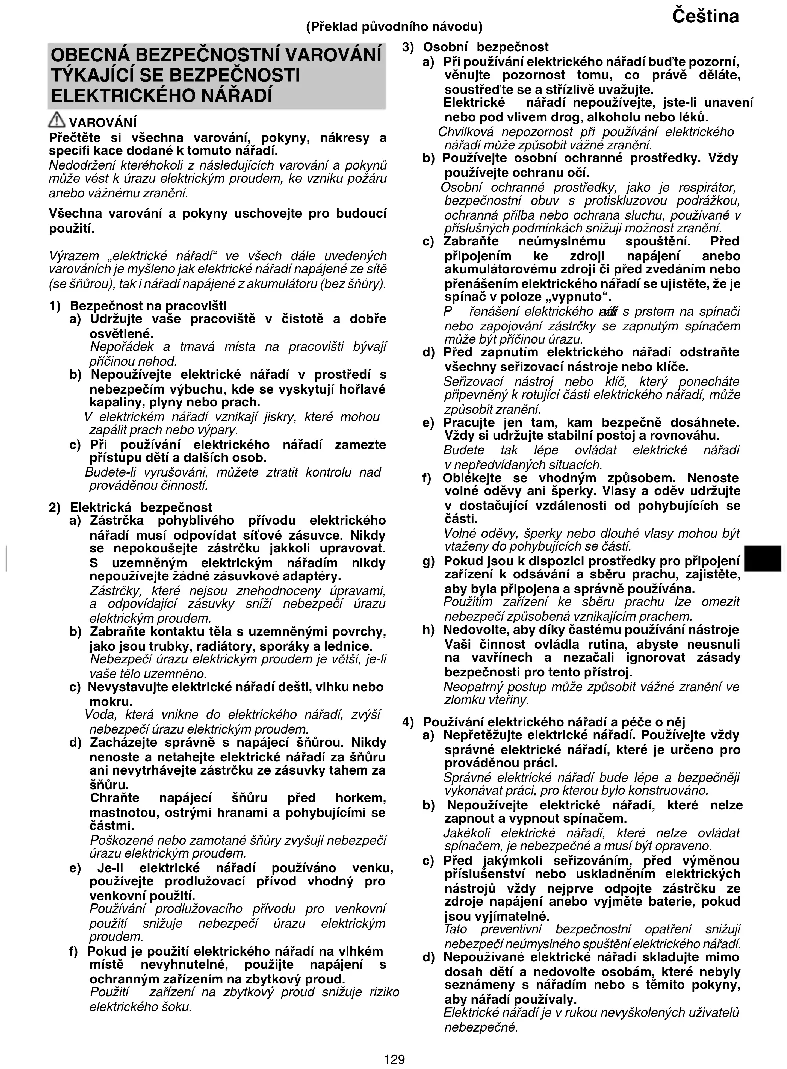 VAROVÁNÍ Přečtěte si všechna varování, pokyny, nákresy a specifi kace dodané k tomuto nářadí. Nedodržení kteréhokoli z následujících varování a pokynů může vést k úrazu elektrickým proudem, ke vzniku požáru anebo vážnému zranění. Všechna varování a pokyny uschovejte pro budoucí použití. Výrazem „elektrické nářadí“ ve všech dále uvedených varováních je myšleno jak elektrické nářadí napájené ze sítě (se šňůrou), tak i nářadí napájené z akumulátoru (bez šňůry).
