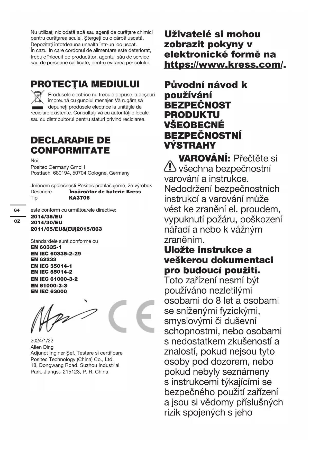 My, Positec Germany GmbH Postfach 680194, 50704 Cologne, Germany V mene spoločnosti Positec vyhlasujeme, že produkt Popis Nabíječka akumulátorů Kress Typ KA3706 splňuje následující směrnice: 2014/35/EU 2014/30/EU 2011/65/EU&(EU)2015/863 Splňované normy EN 60335-1