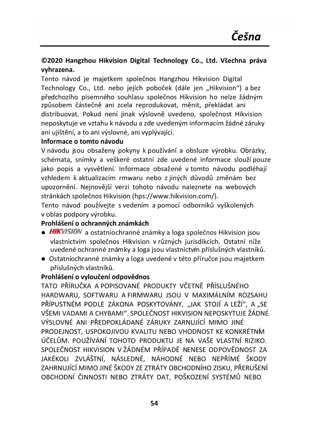 ©2020 Hangzhou Hikvision Digital Technology Co., Ltd. Všechna práva vyhrazena. Tento návod je majetkem společnosti Hangzhou Hikvision Digital Technology Co., Ltd. nebo jejích poboček (dále jen „Hikvision“) a bez předchozího písemného souhlasu společnosti Hikvision ho nelze žádným způsobem částečně ani zcela reprodukovat, měnit, překládat ani distribuovat. Pokud není jinak výslovně uvedeno, společnost Hikvision neposkytuje ve vztahu k návodu a zde uvedeným informacím žádné záruky ani ujištění, a to ani výslovné, ani vyplývající. Informace o tomto návodu V návodu jsou obsaženy pokyny k používání a obsluze výrobku. Obrázky, schémata, snímky a veškeré ostatní zde uvedené informace slouží pouze jako popis a vysvětlení. Informace obsažené v tomto návodu podléhají vzhledem k aktualizacím firmwaru nebo z jiných důvodů změnám bez upozornění. Nejnovější verzi tohoto návodu naleznete na webových stránkách společnosti Hikvision (https://www.hikvision.com/). Tento návod používejte s vedením a pomocí odborníků vyškolených v oblasti podpory výrobku. Prohlášení o ochranných známkách a ostatní ochranné známky a loga společnosti Hikvision jsou vlastnictvím společnosti Hikvision v různých jurisdikcích. Ostatní níže uvedené ochranné známky a loga jsou vlastnictvím příslušných vlastníků. Ostatní ochranné známky a loga uvedené v této příručce jsou majetkem příslušných vlastníků. Prohlášení o vyloučení odpovědnosti TATO PŘÍRUČKA A POPISOVANÉ PRODUKTY VČETNĚ PŘÍSLUŠNÉHO HARDWARU, SOFTWARU A FIRMWARU JSOU V MAXIMÁLNÍM ROZSAHU PŘÍPUSTNÉM PODLE ZÁKONA POSKYTOVÁNY, „JAK STOJÍ A LEŽÍ“, A „SE VŠEMI VADAMI A CHYBAMI“. SPOLEČNOST HIKVISION NEPOSKYTUJE ŽÁDNÉ VÝSLOVNÉ ANI PŘEDPOKLÁDANÉ ZÁRUKY ZARNUJÍCÍ MIMO JINÉ PRODEJNOST, USPOKOJIVOU KVALITU NEBO VHODNOST KE KONKRÉTNÍM ÚČELŮM. POUŽÍVÁNÍ TOHOTO PRODUKTU JE NA VAŠE VLASTNÍ RIZIKO. SPOLEČNOST HIKVISION V ŽÁDNÉM PŘÍPADĚ NENESE ODPOVĚDNOST ZA JAKÉKOLI ZVLÁŠTNÍ, NÁSLEDNÉ, NÁHODNÉ NEBO NEPŘÍMÉ ŠKODY ZAHRNUJÍCÍ MIMO JINÉ ŠKODY ZE ZTRÁTY OBCHODNÍHO ZISKU, PŘERUŠENÍ OBCHODNÍ ČINNOSTI NEBO ZTRÁTY DAT, POŠKOZENÍ SYSTÉMŮ NEBOČeština