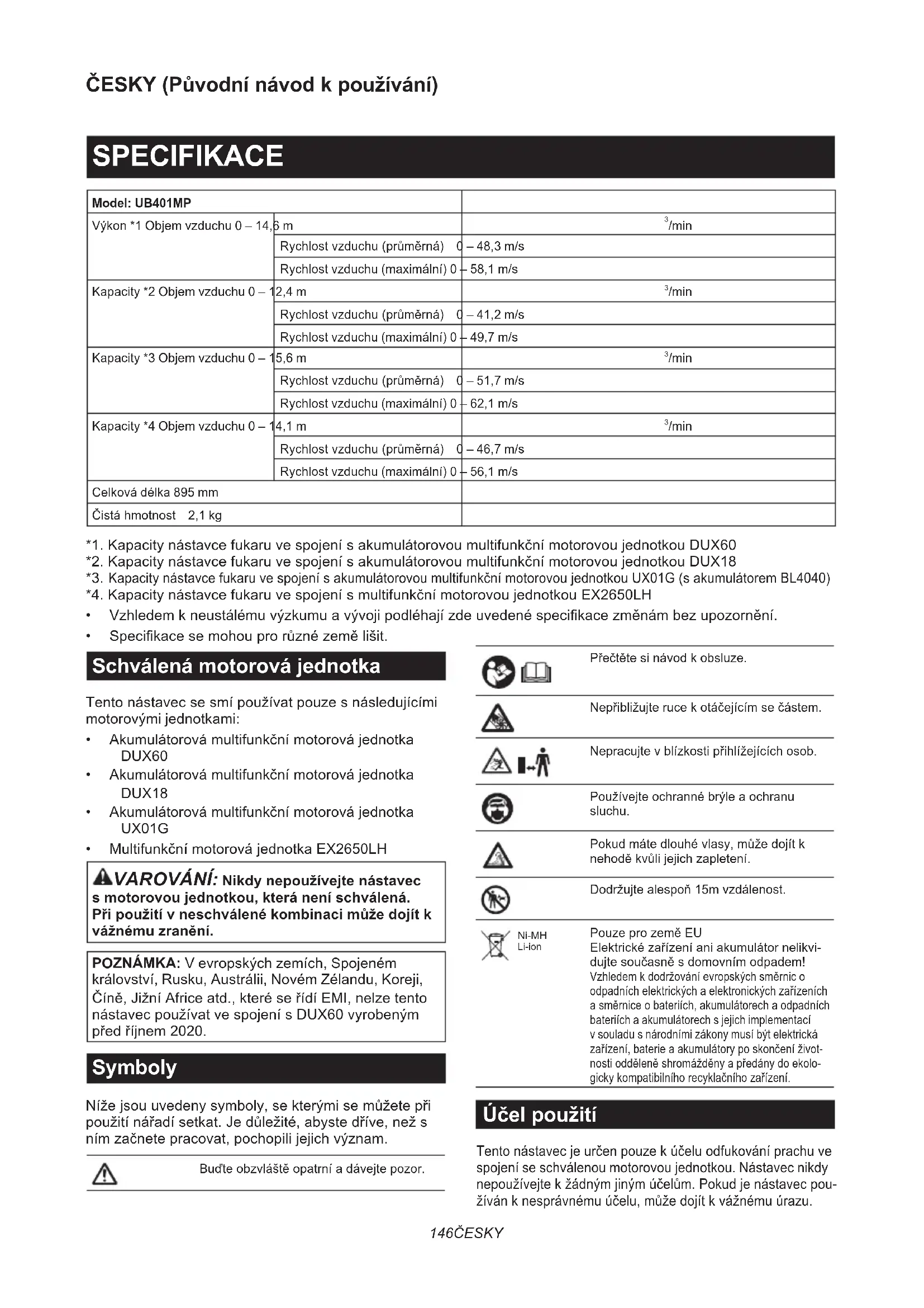 - MultifunkčnímotorovájednotkaEX2650LH VAROVÁNÍ: Nikdy nepoužívejte nástavec s motorovou jednotkou, která není schválená. Při použití v neschválené kombinaci může dojít k vážnému zranění. POZNÁMKA: V evropských zemích, Spojeném království, Rusku, Austrálii, Novém Zélandu, Koreji, Číně,JižníAfriceatd.,kteréseřídíEMI,nelzetento nástavecpoužívatvespojenísDUX60vyrobeným předříjnem2020. Symboly Nížejsouuvedenysymboly,sekterýmisemůžetepři použitínářadísetkat.Jedůležité,abystedříve,nežs nímzačnetepracovat,pochopilijejichvýznam. Buďteobzvláštěopatrníadávejtepozor. Přečtětesinávodkobsluze. Nepřibližujterucekotáčejícímsečástem. Nepracujtevblízkostipřihlížejícíchosob. Používejteochrannébrýleaochranu sluchu. Pokudmátedlouhévlasy,můžedojítk nehoděkvůlijejichzapletení. Dodržujtealespoň15mvzdálenost. Ni-MH Li-ion PouzeprozeměEU Elektrickézařízeníaniakumulátornelikvi- dujtesoučasněsdomovnímodpadem! Vzhledemkdodržováníevropskýchsměrnico odpadníchelektrickýchaelektronickýchzařízeních asměrniceobateriích,akumulátorechaodpadních bateriích a akumulátorech s jejich implementací v souladu s národními zákony musí být elektrická zařízení,baterieaakumulátoryposkončeníživot- nostiodděleněshromážděnyapředánydoekolo- gickykompatibilníhorecyklačníhozařízení. Účel použití Tentonástavecjeurčenpouzekúčeluodfukováníprachuve spojení se schválenou motorovou jednotkou. Nástavec nikdy nepoužívejtekžádnýmjinýmúčelům.Pokudjenástavecpou- žívánknesprávnémuúčelu,můžedojítkvážnémuúrazu.147 ČESKY Prohlášení ES o shodě Pouze pro evropské země My, jako výrobci: Makita Europe N.V., obchodní adresa: Jan-Baptist Vinkstraat 2 3070 Kortenberg BELGIE,pověřujemepanaHirošiho Cudžimuru sestavovánímtechnickéhosouboruaprohlašujemena vlastníodpovědnost,žeprodukty; Popis: Nástavec fukaru. Typový popis: UB401MP. splňujívšechnapříslušnáustanovenísměrnice 2006/42/ESatakésplňujívšechnapříslušnáustano- venínásledujícíchsměrnicES/EU:2000/14/ESaže jsou vyrobeny v souladu s následujícími harmonizova- nými normami: EN 15503:2009+A1:2013+A2:2015, EN 50636-2-100:2014. Místoadatumprohlášení:Kortenberg, Belgie. 29. 10.