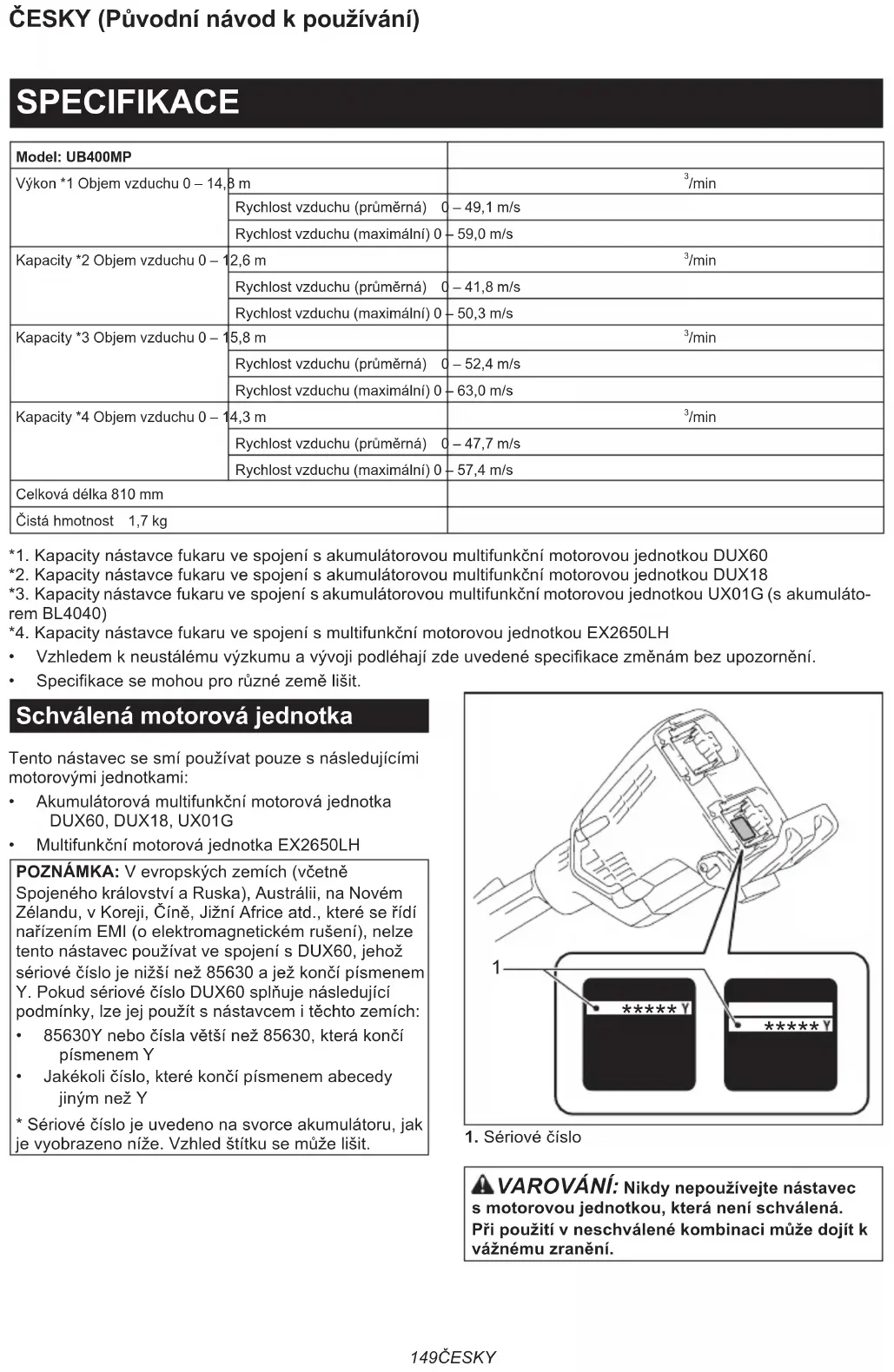 /min Rychlostvzduchu(průměrná) 0 – 47,7 m/sRychlost vzduchu (maximální) 0 – 57,4 m/sCelková délka 810 mmČistáhmotnost 1,7 kg*1.KapacitynástavcefukaruvespojenísakumulátorovoumultifunkčnímotorovoujednotkouDUX60*2.KapacitynástavcefukaruvespojenísakumulátorovoumultifunkčnímotorovoujednotkouDUX18 *3.KapacitynástavcefukaruvespojenísakumulátorovoumultifunkčnímotorovoujednotkouUX01G(sakumuláto- rem BL4040)*4.KapacitynástavcefukaruvespojenísmultifunkčnímotorovoujednotkouEX2650LH• Vzhledemkneustálémuvýzkumuavývojipodléhajízdeuvedenéspecikacezměnámbezupozornění.• Specikacesemohouprorůznézemělišit. Schválená motorová jednotka Tentonástavecsesmípoužívatpouzesnásledujícímimotorovými jednotkami:• AkumulátorovámultifunkčnímotorovájednotkaDUX60, DUX18, UX01G• MultifunkčnímotorovájednotkaEX2650LHPOZNÁMKA:Vevropskýchzemích(včetněSpojeného království a Ruska), Austrálii, na Novém Zélandu,vKoreji,Číně,JižníAfriceatd.,kteréseřídínařízenímEMI(oelektromagnetickémrušení),nelzetentonástavecpoužívatvespojenísDUX60,jehožsériovéčíslojenižšínež85630aježkončípísmenemY.PokudsériovéčísloDUX60splňujenásledujícípodmínky,lzejejpoužítsnástavcemitěchtozemích:• 85630Ynebočíslavětšínež85630,kterákončípísmenem Y• Jakékoličíslo,kterékončípísmenemabecedyjinýmnežY*Sériovéčíslojeuvedenonasvorceakumulátoru,jakjevyobrazenoníže.Vzhledštítkusemůželišit.