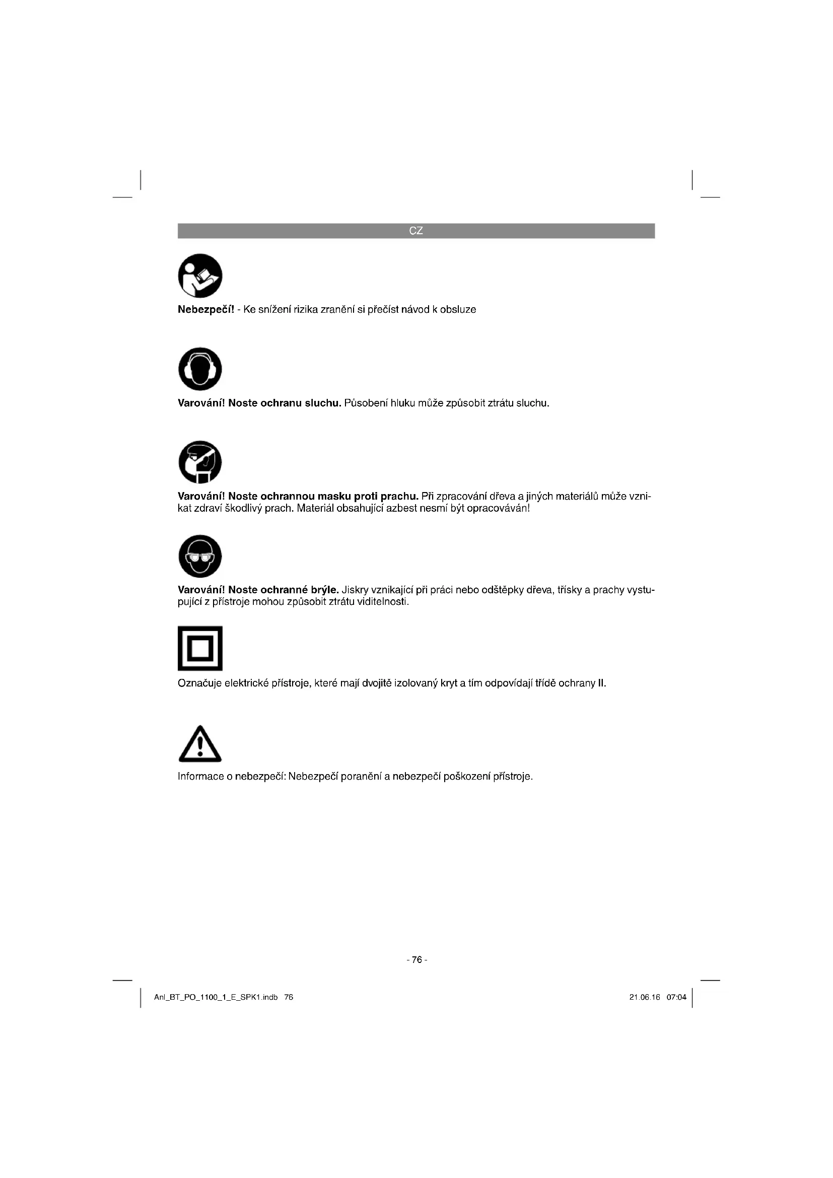Nebezpečí! - Ke snížení rizika zranění si přečíst návod k obsluze Varování! Noste ochranu sluchu. Působení hluku může způsobit ztrátu sluchu. Varování! Noste ochranné brýle. Jiskry vznikající při práci nebo odštěpky dřeva, třísky a prachy vystu- pující z přístroje mohou způsobit ztrátu viditelnosti. Varování! Noste ochrannou masku proti prachu. Při zpracování dřeva a jiných materiálů může vzni- kat zdraví škodlivý prach. Materiál obsahující azbest nesmí být opracováván! Označuje elektrické přístroje, které mají dvojitě izolovaný kryt a tím odpovídají třídě ochrany II. Informace o nebezpečí: Nebezpečí poranění a nebezpečí poškození přístroje. Anl_BT_PO_1100_1_E_SPK1.indb 76Anl_BT_PO_1100_1_E_SPK1.indb 76 21.06.16 07:0421.06.16 07:04CZ