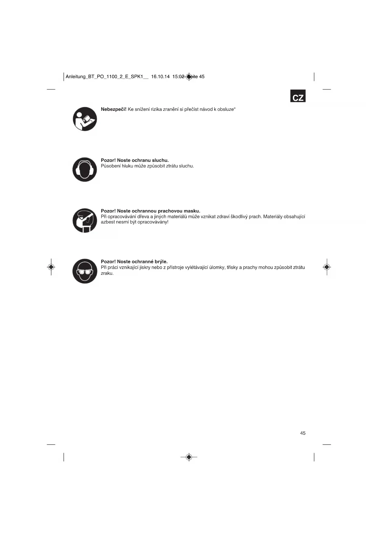 Nebezpeči! Ke snížení rizika zranění si přečíst návod k obsluze“ Pozor! Noste ochranu sluchu. Působení hluku může způsobit ztrátu sluchu. Pozor! Noste ochrannou prachovou masku. Při opracovávání dřeva a jiných materiálů může vznikat zdraví škodlivý prach. Materiály obsahující azbest nesmí být opracovávány! Pozor! Noste ochranné brýle. Při práci vznikající jiskry nebo z přístroje vylétávající úlomky, třísky a prachy mohou způsobit ztrátu zraku. Anleitung_BT_PO_1100_2_E_SPK1__ 16.10.14 15:02 Seite 45Nebezpeči! Při používání přístrojů musí být dodržována určitá bezpečnostní opatření, aby se zabránilo zraněním a škodám. Přečtěte si proto pečlivě tento návod k obsluze. Dobře si ho uložte, abyste měli tyto informace kdykoliv po ruce. Pokud předáte přístroj jiným osobám, předejte s ním i tento návod k obsluze. Nepřebíráme žádné ručení za škody a úrazy vzniklé v důsledku nedodržování tohoto návodu k obsluze a bezpečnostních pokynů.