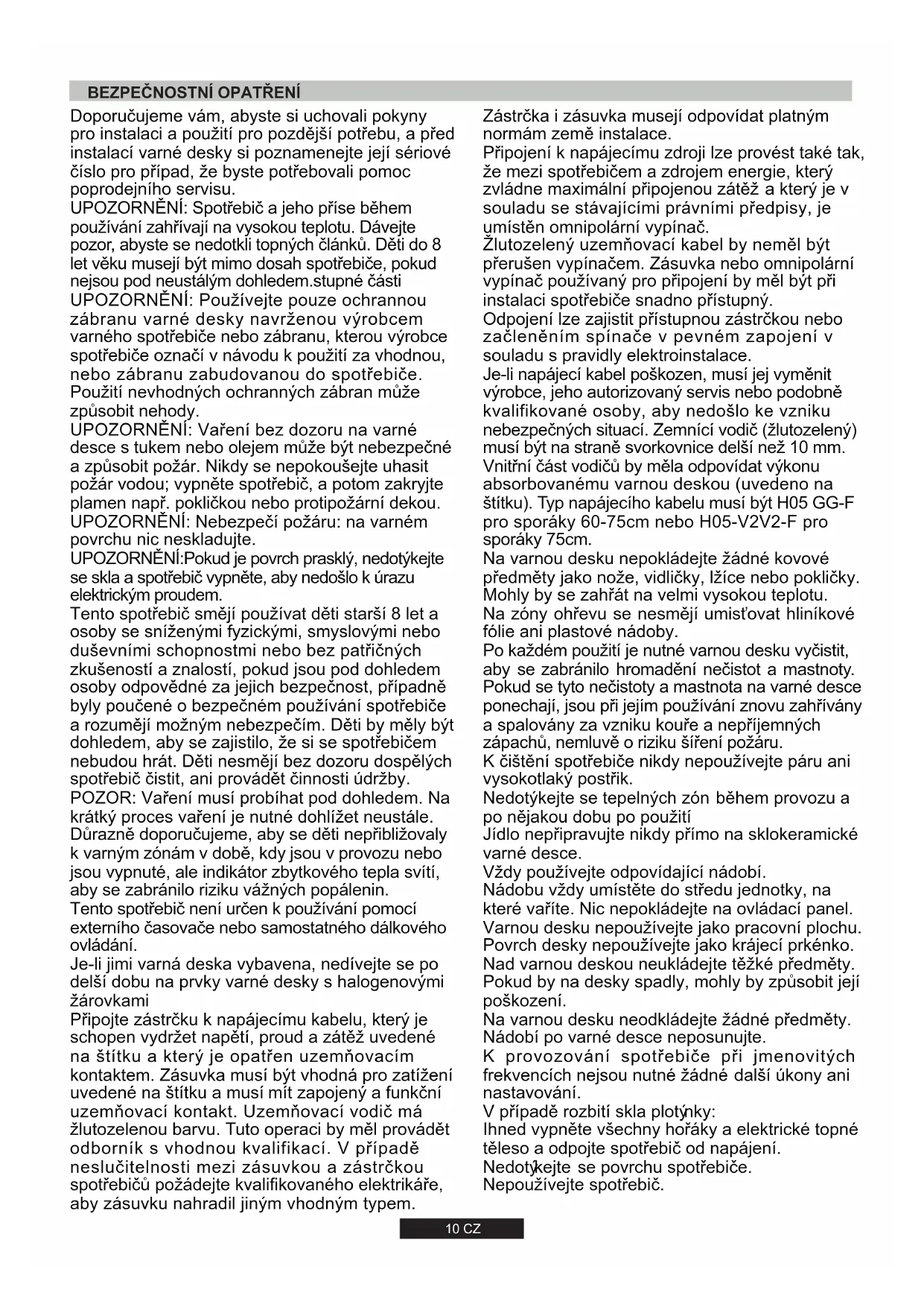 Zkontrolujte data na výrobním štítku, na vnější straně přístroje, pro kontrolu, zda napětí odpovídá napětí elektrické sítě. Před připojením zkontrolujte uzemnění. Tento spotřebič musí být uzemněný. Pokud tuto podmínku nesplníte, výrobce nenese žádnou odpovědnost za poškození spotřebiče nebo úrazy osob. Pokud přívodní kabel není vybavený zástrčkou, připojte vhodnou zástrčku podle údajů na výrobním štítku. Uzemňovací systém je barevně označený žlutozelenou. Zástrčka musí zůstat i po instalaci snadno přístupná. Pokud je varná deska připojená přímo k elektrické síti, musíte instalovat odpojovací zařízení. Pokud se poškodí přívodní kabel, musí jej vyměnit kvalifikovaný servisní technik, aby se zabránilo možnému nebezpečí. Uzemňovací vodič (žlutozelený) musí být nejméně o 10 mm delší než živý a neutrální vodič.Použijte vhodný kabel podle parametrů výkonu trouby. Zkontrolujte výrobní štítek a ujistěte se, zda je přívodní kabel typu 3x0.75 mm² H05 GG-F pro sporáky 60-75cm nebo H05-V2V2-F pro sporáky 75cm. Živý Uzemnění Neutrální