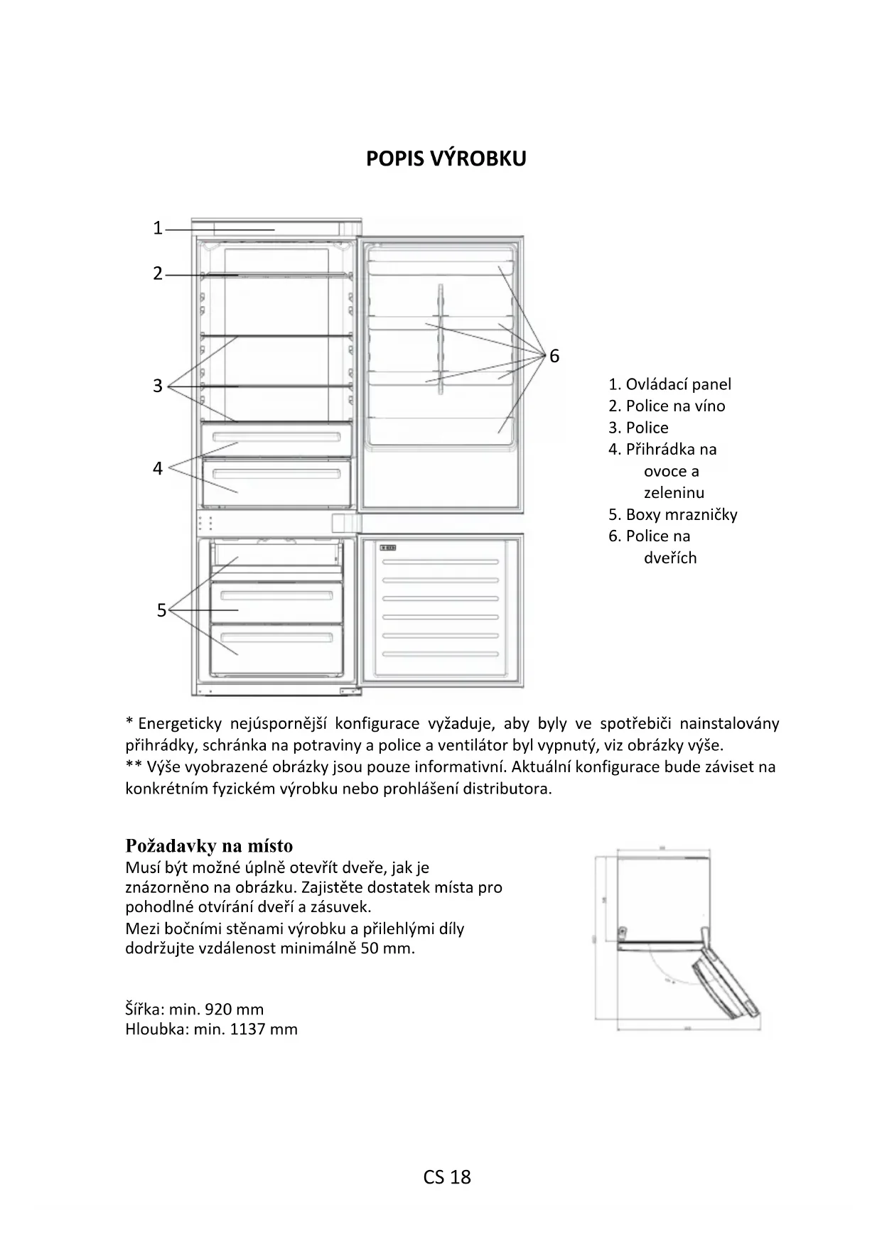 - Energeticky nejúspornější konfigurace vyžaduje, aby byly ve spotřebiči nainstalovány přihrádky, schránka na potraviny a police a ventilátor byl vypnutý, viz obrázky výše. ** Výše vyobrazené obrázky jsou pouze informativní. Aktuální konfigurace bude záviset na konkrétním fyzickém výrobku nebo prohlášení distributora. Požadavky na místo Musí být možné úplně otevřít dveře, jak je znázorněno na obrázku. Zajistěte dostatek místa pro pohodlné otvírání dveří a zásuvek. Mezi bočními stěnami výrobku a přilehlými díly dodržujte vzdálenost minimálně 50 mm. Šířka: min. 920 mm Hloubka: min. 1137 mm