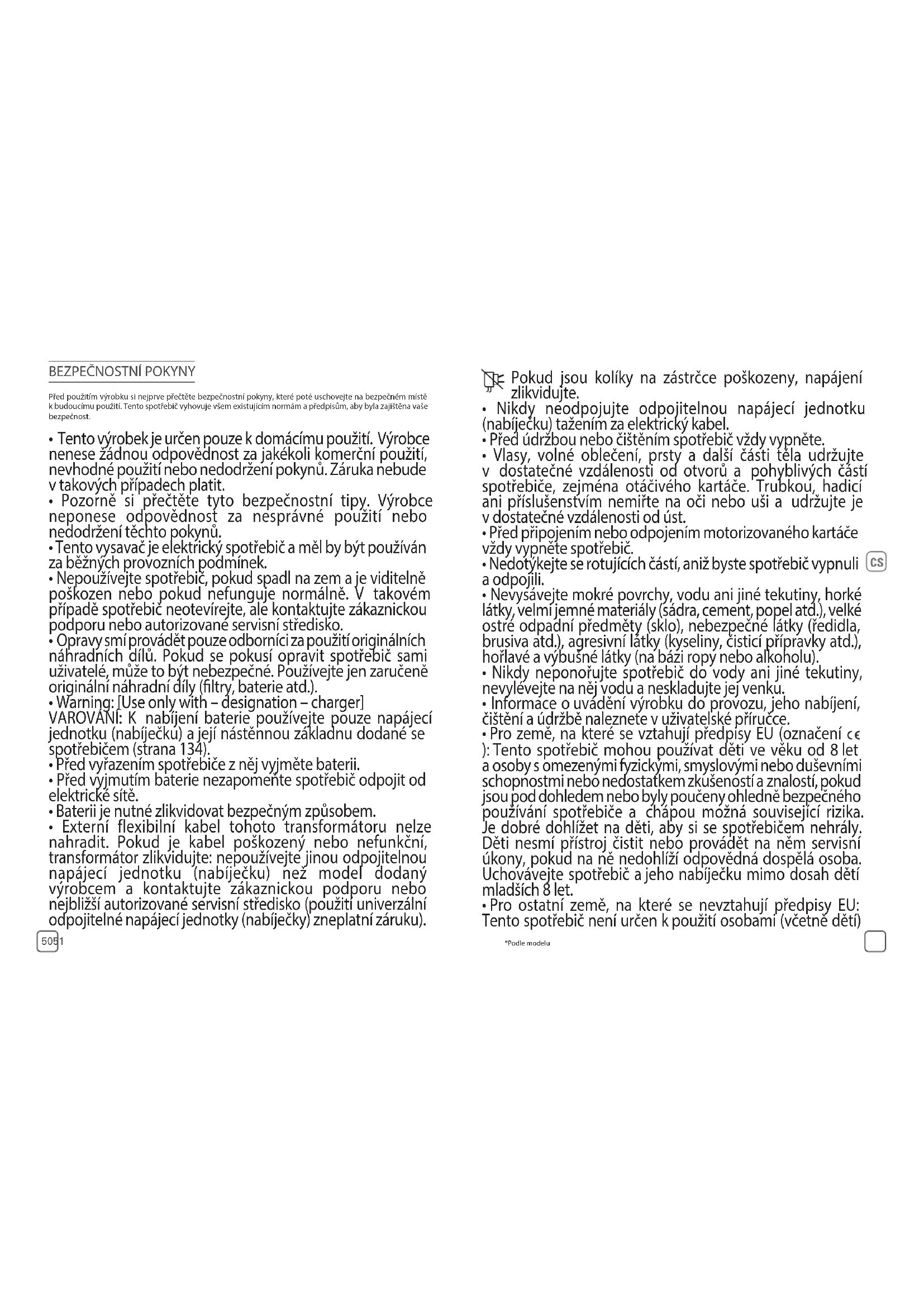 - VAROVÁNÍ– Baterie použitá vtomto spotřebiči může při nesprávném použití představovat riziko požáru nebo poleptání. Baterii nerozebírejte, nezkratujte, nevhazujte do ohně askladujte jej při teplotách vrozmezí 0–45°C. Držte mimo dosah dětí. Baterii nerozebírejte anevhazujte do ohně.CS