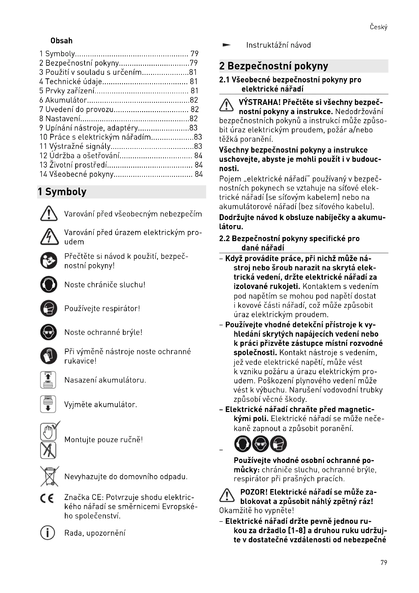 - 14 Všeobecné pokyny 1 Symboly Varování před všeobecným nebezpečím Varování před úrazem elektrickým pro udem Přečtěte si návod k použití, bezpeč nostní pokyny! Noste chrániče sluchu! Používejte respirátor! Noste ochranné brýle! Při výměně nástroje noste ochranné rukavice! Nasazení akumulátoru. Vyjměte akumulátor. Montujte pouze ručně! Nevyhazujte do domovního odpadu. Značka CE: Potvrzuje shodu elektric kého nářadí se směrnicemi Evropské ho společenství. Rada, upozornění Instruktážní návod 2 Bezpečnostní pokyny p. 84
