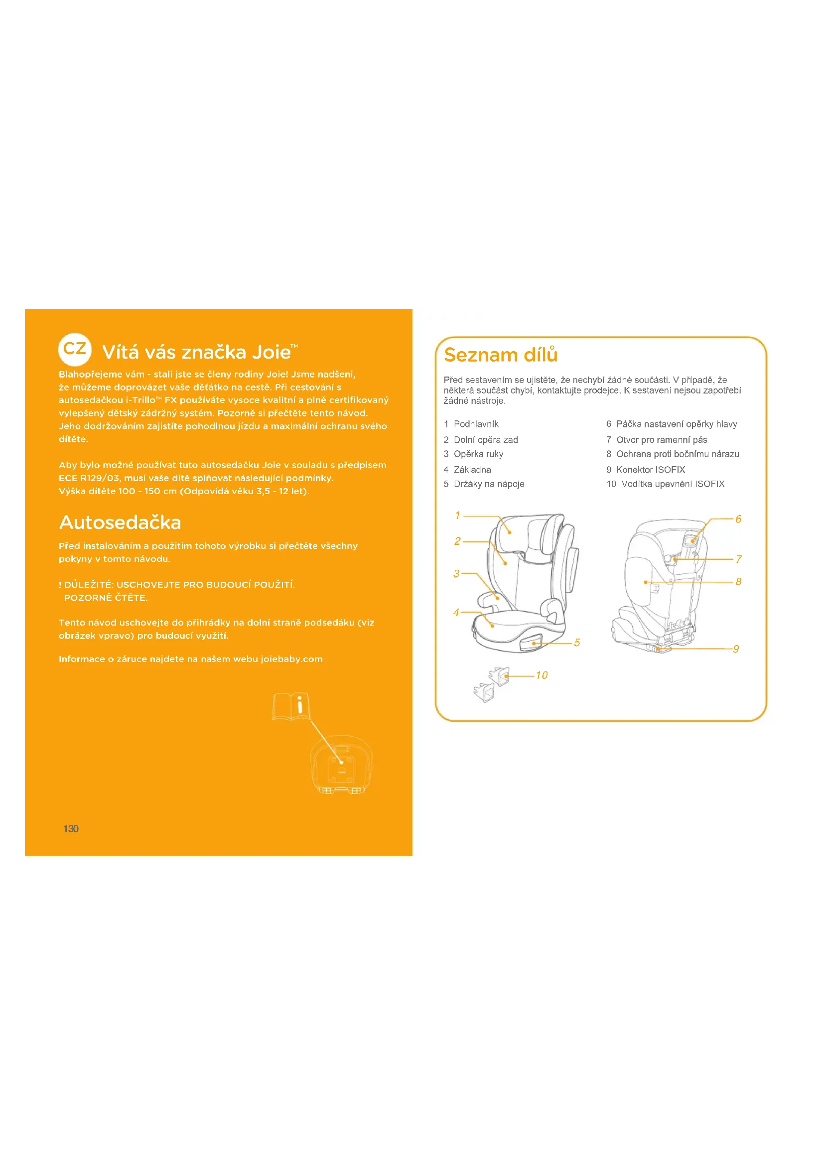 Blahopřejeme vám - stali jste se členy rodiny Joie! Jsme nadšeni, že můžeme doprovázet vaše děťátko na cestě. Při cestování s autosedačkou i-Trillo™ FX používáte vysoce kvalitní a plně certifikovaný vylepšený dětský zádržný systém. Pozorně si přečtěte tento návod. Jeho dodržováním zajistíte pohodlnou jízdu a maximální ochranu svého dítěte.Aby bylo možné používat tuto autosedačku Joie v souladu s předpisem ECE R129/03, musí vaše dítě splňovat následující podmínky.Výška dítěte 100 - 150 cm (Odpovídá věku 3,5 - 12 let). Autosedačka Před instalováním a použitím tohoto výrobku si přečtěte všechny pokyny v tomto návodu.! DŮLEŽITÉ: USCHOVEJTE PRO BUDOUCÍ POUŽITÍ. POZORNĚ ČTĚTE.Tento návod uschovejte do přihrádky na dolní straně podsedáku (viz obrázek vpravo) pro budoucí využití.Informace o záruce najdete na našem webu joiebaby.com