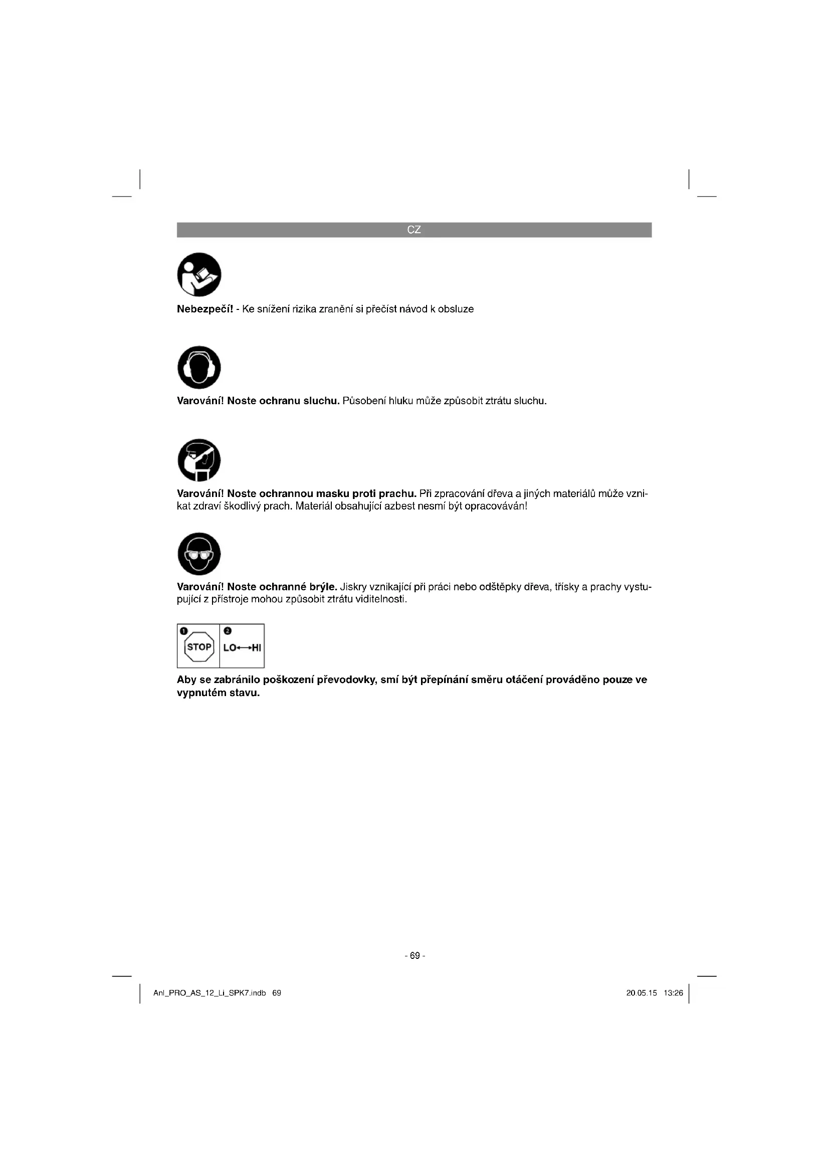 Nebezpečí! - Ke snížení rizika zranění si přečíst návod k obsluze Varování! Noste ochranu sluchu. Působení hluku může způsobit ztrátu sluchu. Varování! Noste ochranné brýle. Jiskry vznikající při práci nebo odštěpky dřeva, třísky a prachy vystu- pující z přístroje mohou způsobit ztrátu viditelnosti. Varování! Noste ochrannou masku proti prachu. Při zpracování dřeva a jiných materiálů může vzni- kat zdraví škodlivý prach. Materiál obsahující azbest nesmí být opracováván! Aby se zabránilo poškození převodovky, smí být přepínání směru otáčení prováděno pouze ve vypnutém stavu. Anl_PRO_AS_12_Li_SPK7.indb 69Anl_PRO_AS_12_Li_SPK7.indb 69 20.05.15 13:2620.05.15 13:26CZ