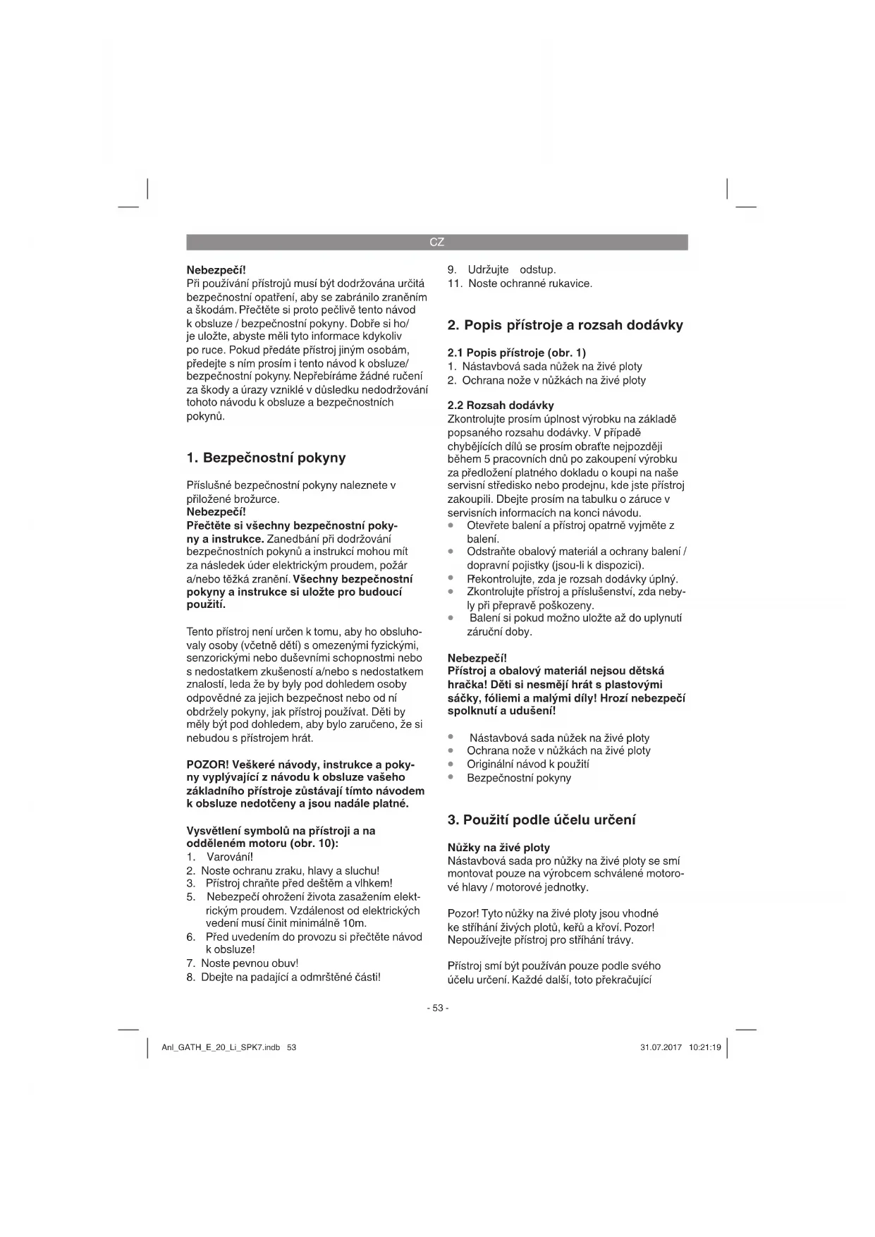 Nůžky na živé ploty Nástavbová sada pro nůžky na živé ploty se smí montovat pouze na výrobcem schválené motoro- vé hlavy / motorové jednotky. Pozor! Tyto nůžky na živé ploty jsou vhodné ke stříhání živých plotů, keřů a křoví. Pozor! Nepoužívejte přístroj pro stříhání trávy. Přístroj smí být používán pouze podle svého účelu určení. Každé další, toto překračující Anl_GATH_E_20_Li_SPK7.indb 53Anl_GATH_E_20_Li_SPK7.indb 53 31.07.2017 10:21:1931.07.2017 10:21:19CZ