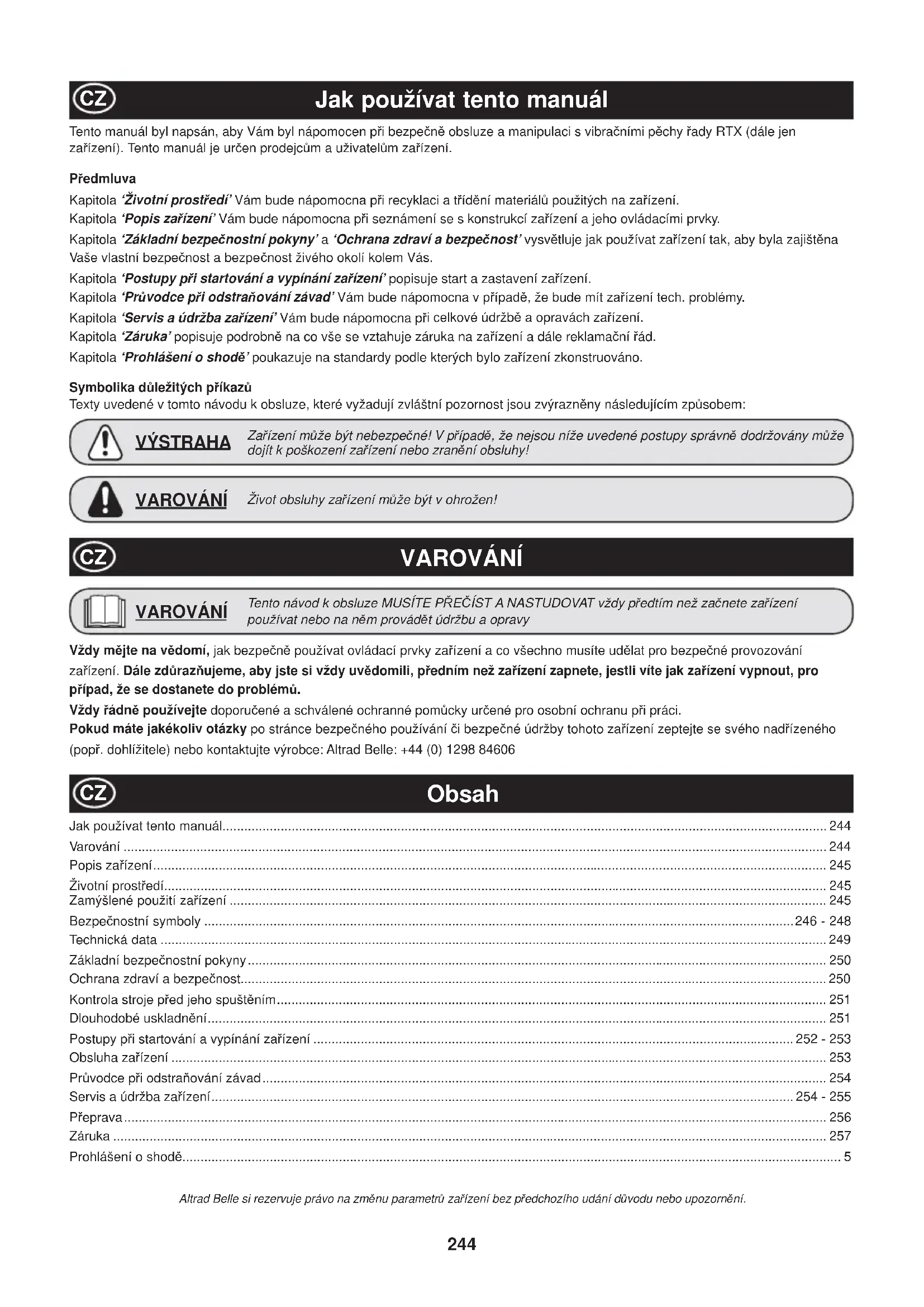 Tento manuál byl napsán, aby Vám byl nápomocen pĜi bezpeþnČ obsluze a manipulaci s vibraþními pČchy Ĝady RTX (dále jen zaĜízení). Tento manuál je urþen prodejcĤm a uživatelĤm zaĜízení. PĜedmluva Kapitola ‘Životní prostĜedí’ Vám bude nápomocna pĜi recyklaci a tĜídČní materiálĤ použitých na zaĜízení. Kapitola ‘Popis zaĜízení’ Vám bude nápomocna pĜi seznámení se s konstrukcí zaĜízení a jeho ovládacími prvky. Kapitola ‘Základní bezpeþnostní pokyny’ a ‘Ochrana zdraví a bezpeþnost’ vysvČtluje jak používat zaĜízení tak, aby byla zajištČna Vaše vlastní bezpeþnost a bezpeþnost živého okolí kolem Vás. Kapitola ‘Postupy pĜi startování a vypínání zaĜízení’ popisuje start a zastavení zaĜízení. Kapitola ‘PrĤvodce pĜi odstraĖování závad’ Vám bude nápomocna v pĜípadČ, že bude mít zaĜízení tech. problémy. Kapitola ‘Servis a údržba zaĜízení’ Vám bude nápomocna pĜ i celkové údržbČ a opravách zaĜízení. Kapitola ‘Záruka’ popisuje podrobnČ na co vše se vztahuje záruka na zaĜízení a dále reklamaþní Ĝád. Kapitola ‘Prohlášení o shodČ’ poukazuje na standardy podle kterých bylo zaĜízení zkonstruováno. Symbolika dĤležitých pĜíkazĤ Texty uvedené v tomto návodu k obsluze, které vyžadují zvláštní pozornost jsou zvýraznČny následujícím zpĤsobem: Život obsluhy zaĜízení mĤže být v ohrožen! VAROVÁNÍ ZaĜízení mĤže být nebezpeþné! V pĜípadČ, že nejsou níže uvedené postupy správnČ dodržovány mĤže dojít k poškození zaĜízení nebo zranČní obsluhy! VÝSTRAHA VAROVÁNÍ
