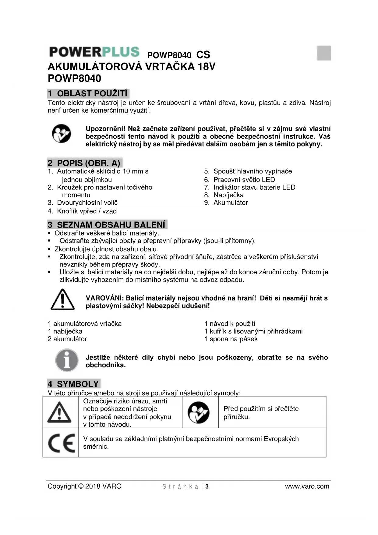 V souladu se základními platnými bezpečnostními normami Evropských směrnic.POWP8040 CS Copyright © 2018 VARO S t r á n k a | 4 www.varo.com