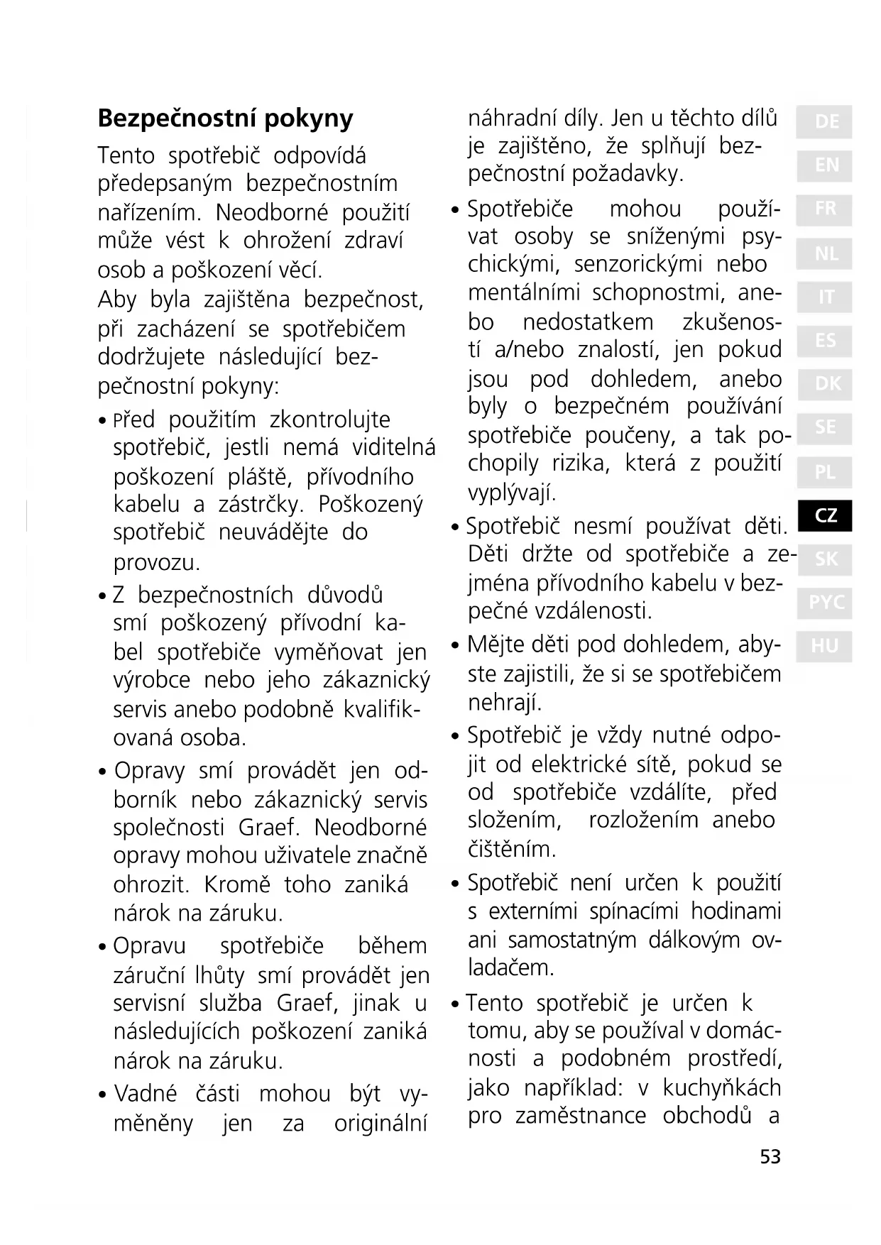 - Opravy smí provádět jen od- borník nebo zákaznický servis společnosti Graef. Neodborné opravy mohou uživatele značně ohrozit. Kromě toho zaniká nárok na záruku.