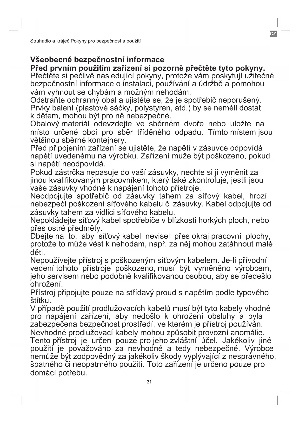 Všeobecné bezpečnostní informace Před prvním použitím zařízení si pozorně přečtěte tyto pokyny. Přečtěte si pečlivě následující pokyny, protože vám poskytují užitečné bezpečnostní informace o instalaci, používání a údržbě a pomohou vám vyhnout se chybám a možným nehodám. Odstraňte ochranný obal a ujistěte se, že je spotřebič neporušený. Prvky balení (plastové sáčky, polystyren, atd.) by se neměli dostat k dětem, mohou být pro ně nebezpečné. Obalový materiál odevzdejte ve sběrném dvoře nebo uložte na místo určené obcí pro sběr tříděného odpadu. Tímto místem jsou většinou sběrné kontejnery. Před připojením zařízení se ujistěte, že napětí v zásuvce odpovídá napětí uvedenému na výrobku. Zařízení může být poškozeno, pokud si napětí neodpovídá. Pokud zástrčka nepasuje do vaší zásuvky, nechte si ji vyměnit za jinou kvalikovaným pracovníkem, který také zkontroluje, jestli jsou vaše zásuvky vhodné k napájení tohoto přístroje. Neodpojujte spotřebič od zásuvky tahem za síťový kabel, hrozí nebezpečí poškození síťového kabelu či zásuvky. Kabel odpojujte od zásuvky tahem za vidlici síťového kabelu. Nepokládejte síťový kabel spotřebiče v blízkosti horkých ploch, nebo přes ostré předměty. Dbejte na to, aby síťový kabel nevisel přes okraj pracovní plochy, protože to může vést k nehodám, např. za něj mohou zatáhnout malé děti. Nepoužívejte přístroj s poškozeným síťovým kabelem. Je-li přívodní vedení tohoto přístroje poškozeno, musí být vyměněno výrobcem, jeho servisem nebo podobně kvalikovanou osobou, aby se předešlo ohrožení. Přístroj připojujte pouze na střídavý proud s napětím podle typového štítku. V případě použití prodlužovacích kabelů musí být tyto kabely vhodné pro napájení zařízení, aby nedošlo k ohrožení obsluhy a byla zabezpečena bezpečnost prostředí, ve kterém je přístroj používán. Nevhodné prodlužovací kabely mohou způsobit provozní anomálie. Tento přístroj je určen pouze pro jeho zvláštní účel. Jakékoliv jiné použití je považováno za nevhodné a tedy nebezpečné. Výrobce nemůže být zodpovědný za jakékoliv škody vyplývající z nesprávného, špatného či neopatrného použití. Toto zařízení je určeno pouze pro domácí potřebu.Struhadlo a kráječ Pokyny pro bezpečnost a použití