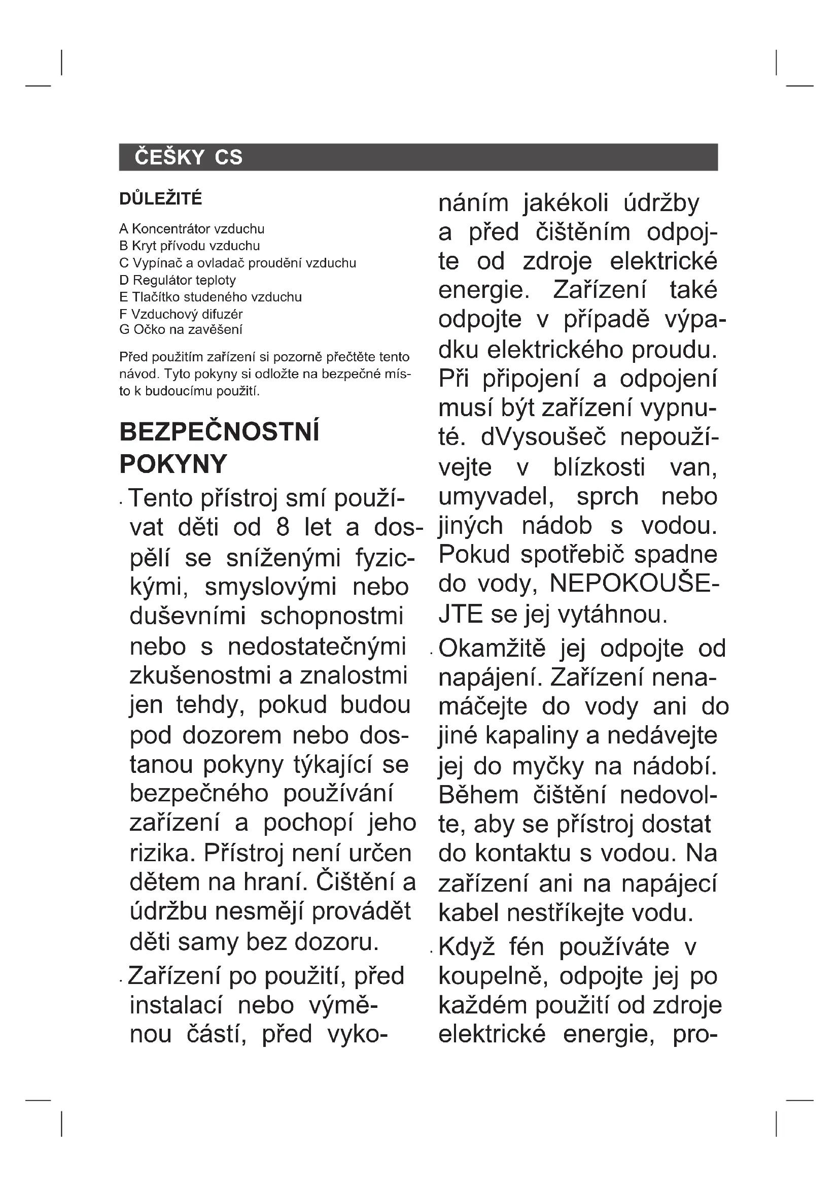 A Koncentrátor vzduchu B Kryt přívodu vzduchu C Vypínač a ovladač proudění vzduchu D Regulátor teploty E Tlačítko studeného vzduchu F Vzduchový difuzér G Očko na zavěšení Před použitím zařízení si pozorně přečtěte tento návod. Tyto pokyny si odložte na bezpečné mís- to k budoucímu použití. BEZPEČNOSTNÍ POKYNY