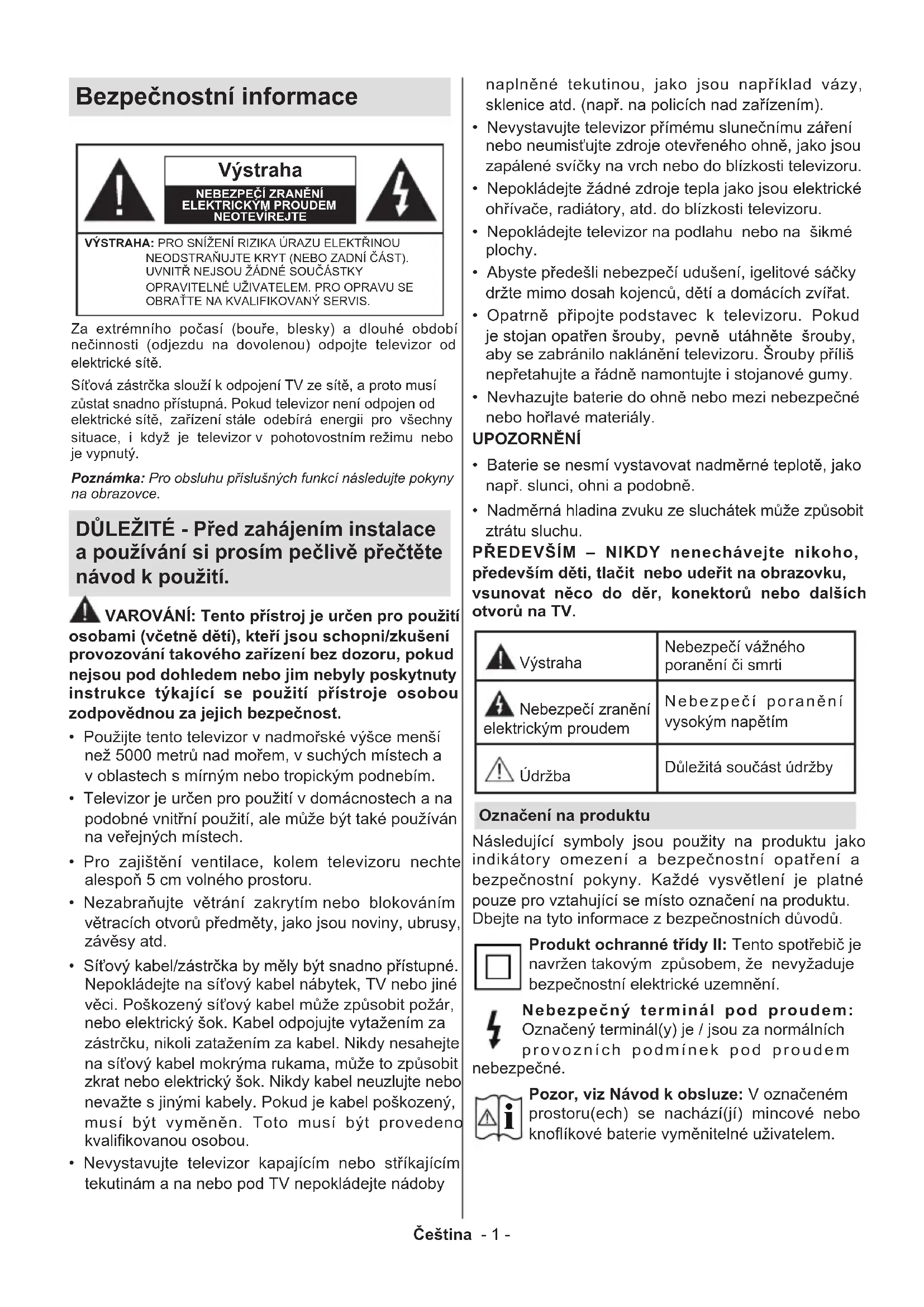 (**)W zależności od modeluČeština - 1 - Bezpečnostní informace Výstraha NEBEZPEČÍ ZRANĚNÍ ELEKTRICKÝM PROUDEMNEOTEVÍREJTEVÝSTRAHA: PRO SNÍŽENÍ RIZIKA ÚRAZU ELEKTŘINOU NEODSTRAŇUJTE KRYT (NEBO ZADNÍ ČÁST). UVNITŘ NEJSOU ŽÁDNÉ SOUČÁSTKY OPRAVITELNÉ UŽIVATELEM. PRO OPRAVU SE OBRAŤTE NA KVALIFIKOVANÝ SERVIS.Poznámka: Pro obsluhu příslušných funkcí následujte pokyny na obrazovce.Za extrémního počasí (bouře, blesky) a dlouhé období nečinnosti (odjezdu na dovolenou) odpojte televizor od elektrické sítě.Síťová zástrčka slouží k odpojení TV ze sítě, a proto musí zůstat snadno přístupná. Pokud televizor není odpojen od elektrické sítě, zařízení stále odebírá energii pro všechny situace, i když je televizor v pohotovostním režimu nebo je vypnutý. DŮLEŽITÉ - Před zahájením instalace a používání si prosím pečlivě přečtěte návod k použití. VAROVÁNÍ: Tento přístroj je určen pro použití osobami (včetně dětí), kteří jsou schopni/zkušení provozování takového zařízení bez dozoru, pokud nejsou pod dohledem nebo jim nebyly poskytnuty instrukce týkající se použití přístroje osobou zodpovědnou za jejich bezpečnost.