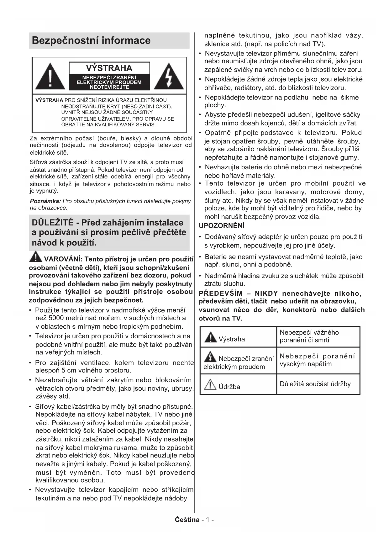 (**)W zależności od modeluČeština - 1 - Bezpečnostní informace VÝSTRAHA NEBEZPEČÍ ZRANĚNÍ ELEKTRICKÝM PROUDEMNEOTEVÍREJTEVÝSTRAHA PRO SNÍŽENÍ RIZIKA ÚRAZU ELEKTŘINOU NEODSTRAŇUJTE KRYT (NEBO ZADNÍ ČÁST). UVNITŘ NEJSOU ŽÁDNÉ SOUČÁSTKY OPRAVITELNÉ UŽIVATELEM. PRO OPRAVU SE OBRAŤTE NA KVALIFIKOVANÝ SERVIS.Poznámka: Pro obsluhu příslušných funkcí následujte pokyny na obrazovce.Za extrémního počasí (bouře, blesky) a dlouhé období nečinnosti (odjezdu na dovolenou) odpojte televizor od elektrické sítě.Síťová zástrčka slouží k odpojení TV ze sítě, a proto musí zůstat snadno přístupná. Pokud televizor není odpojen od elektrické sítě, zařízení stále odebírá energii pro všechny situace, i když je televizor v pohotovostním režimu nebo je vypnutý. DŮLEŽITÉ - Před zahájením instalace a používání si prosím pečlivě přečtěte návod k použití. VAROVÁNÍ: Tento přístroj je určen pro použití osobami (včetně dětí), kteří jsou schopni/zkušení provozování takového zařízení bez dozoru, pokud nejsou pod dohledem nebo jim nebyly poskytnuty instrukce týkající se použití přístroje osobou zodpovědnou za jejich bezpečnost.