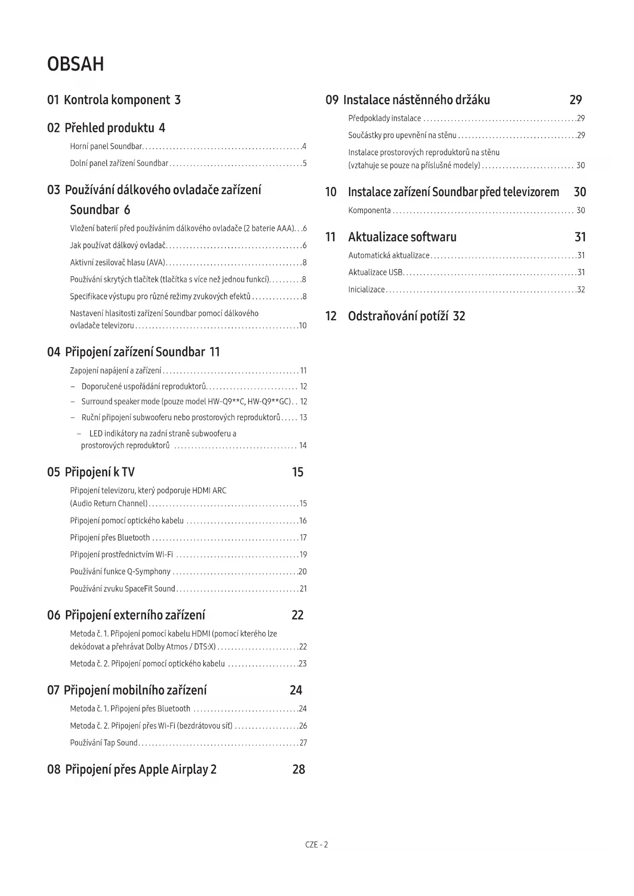 - Soundbar je kompatibilan sa sustavom AirPlay2 instaliranom na uređaju iOS 13.4 ili novijem.CZE - 2 OBSAH 01 Kontrola komponent 3 02 Přehled produktu 4 Horní panel Soundbar. . . . . . . . . . . . . . . . . . . . . . . . . . . . . . . . . . . . . . . . . . . . . . .4 Dolní panel zařízení Soundbar . . . . . . . . . . . . . . . . . . . . . . . . . . . . . . . . . . . . . . .5 03 Používání dálkového ovladače zařízení Soundbar 6 Vložení baterií před používáním dálkového ovladače (2 baterie AAA). . .6 Jak používat dálkový ovladač. . . . . . . . . . . . . . . . . . . . . . . . . . . . . . . . . . . . . . . .6 Aktivní zesilovač hlasu (AVA). . . . . . . . . . . . . . . . . . . . . . . . . . . . . . . . . . . . . . . .8 Používání skrytých tlačítek (tlačítka s více než jednou funkcí). . . . . . . . . .8 Specikace výstupu pro různé režimy zvukových efektů . . . . . . . . . . . . . . .8 Nastavení hlasitosti zařízení Soundbar pomocí dálkového ovladače televizoru. . . . . . . . . . . . . . . . . . . . . . . . . . . . . . . . . . . . . . . . . . . . . . . .10 04 Připojení zařízení Soundbar 11 Zapojení napájení a zařízení . . . . . . . . . . . . . . . . . . . . . . . . . . . . . . . . . . . . . . . . 11 ‒ Doporučené uspořádání reproduktorů . . . . . . . . . . . . . . . . . . . . . . . . . . . 12 ‒ Surround speaker mode (pouze model HW-Q9**C, HW-Q9**GC) . . 12 ‒ Ruční připojení subwooferu nebo prostorových reproduktorů . . . . . 13 ‒ LED indikátory na zadní straně subwooferu a prostorových reproduktorů . . . . . . . . . . . . . . . . . . . . . . . . . . . . . . . . . . . . 14 05 Připojení k TV 15 Připojení televizoru, který podporuje HDMI ARC (Audio Return Channel). . . . . . . . . . . . . . . . . . . . . . . . . . . . . . . . . . . . . . . . . . . .15 Připojení pomocí optického kabelu . . . . . . . . . . . . . . . . . . . . . . . . . . . . . . . . .16 Připojení přes Bluetooth . . . . . . . . . . . . . . . . . . . . . . . . . . . . . . . . . . . . . . . . . . . 17 Připojení prostřednictvím Wi-Fi . . . . . . . . . . . . . . . . . . . . . . . . . . . . . . . . . . . .19 Používání funkce Q-Symphony . . . . . . . . . . . . . . . . . . . . . . . . . . . . . . . . . . . . .20 Používání zvuku SpaceFit Sound. . . . . . . . . . . . . . . . . . . . . . . . . . . . . . . . . . . .21 06 Připojení externího zařízení 22 Metoda č. 1. Připojení pomocí kabelu HDMI (pomocí kterého lze dekódovat a přehrávat Dolby Atmos / DTS:X) . . . . . . . . . . . . . . . . . . . . . . . .22 Metoda č. 2. Připojení pomocí optického kabelu . . . . . . . . . . . . . . . . . . . . .23 07 Připojení mobilního zařízení 24 Metoda č. 1. Připojení přes Bluetooth . . . . . . . . . . . . . . . . . . . . . . . . . . . . . . .24 Metoda č. 2. Připojení přes Wi-Fi (bezdrátovou síť) . . . . . . . . . . . . . . . . . . .26 Používání Tap Sound. . . . . . . . . . . . . . . . . . . . . . . . . . . . . . . . . . . . . . . . . . . . . . .27 08 Připojení přes Apple Airplay 2 28 09 Instalace nástěnného držáku 29 Předpoklady instalace . . . . . . . . . . . . . . . . . . . . . . . . . . . . . . . . . . . . . . . . . . . . .29 Součástky pro upevnění na stěnu . . . . . . . . . . . . . . . . . . . . . . . . . . . . . . . . . . .29 Instalace prostorových reproduktorů na stěnu (vztahuje se pouze na příslušné modely) . . . . . . . . . . . . . . . . . . . . . . . . . . . 30 10 Instalace zařízení Soundbar před televizorem 30 Komponenta . . . . . . . . . . . . . . . . . . . . . . . . . . . . . . . . . . . . . . . . . . . . . . . . . . . . . 30 11 Aktualizace softwaru 31 Automatická aktualizace. . . . . . . . . . . . . . . . . . . . . . . . . . . . . . . . . . . . . . . . . . .31 Aktualizace USB. . . . . . . . . . . . . . . . . . . . . . . . . . . . . . . . . . . . . . . . . . . . . . . . . . .31 Inicializace. . . . . . . . . . . . . . . . . . . . . . . . . . . . . . . . . . . . . . . . . . . . . . . . . . . . . . . .32 12 Odstraňování potíží 32CZE - 3 01 KONTROLA KOMPONENT SOUNDBAR Hlavní jednotka zařízení Soundbar Dálkový ovladač / baterie k zařízení Soundbar Subwoofer POWER 2 ks 4 nebo 2 ks Prostorový reproduktor (volitelně) (levý / pravý) Napájecí kabel (subwoofer, prostorový reproduktor, Soundbar) (volitelně) Kabel HDMI 2 ks 2 ks (M4 × L10) Průvodce upevněním na stěnu Držák šroubu Šroub 2 ks 4 ks Držák pro upevnění na stěnu Pryžová podložka