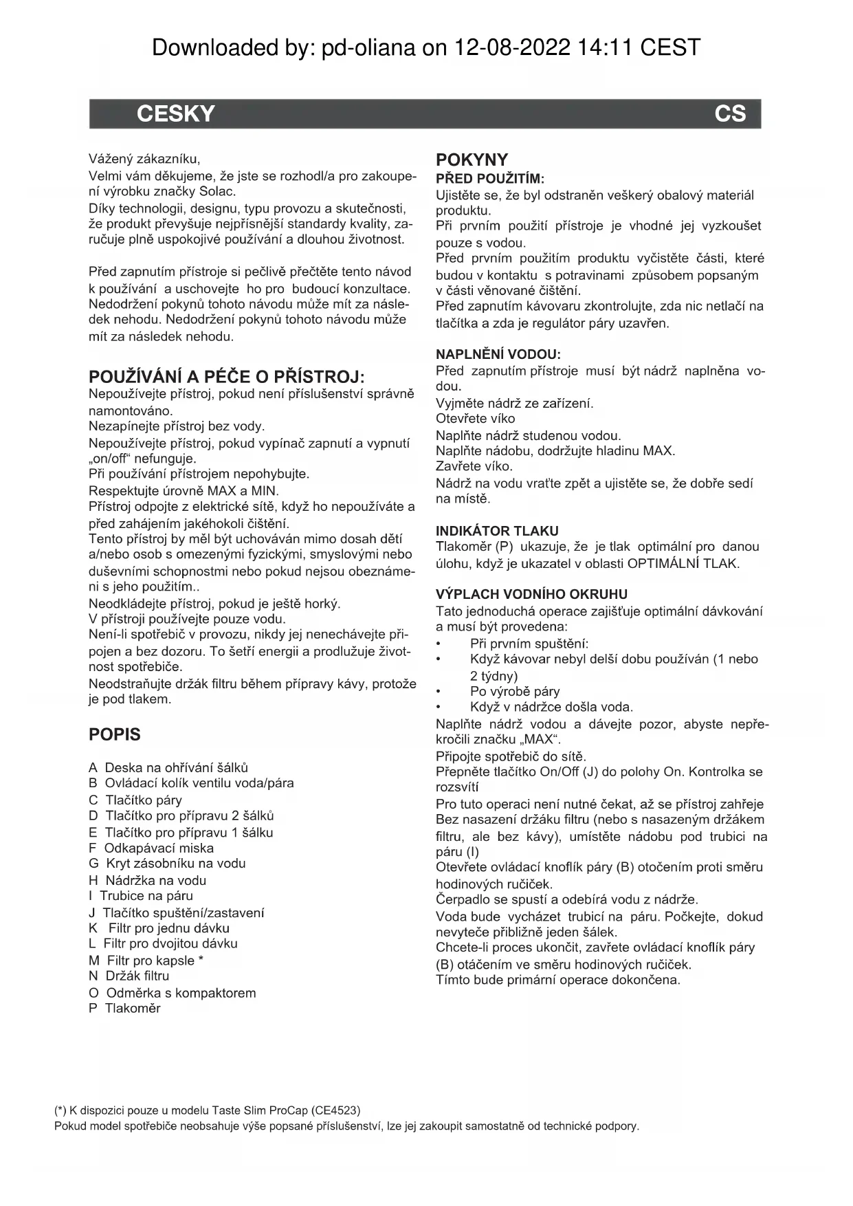 ΟΙΚΟΛΟΓΙΑ ΚΑΙ ΑΝΑΚΥΚΛΩΣΙΜΟΤΗΤΑ ΤΟΥ ΠΡΟΪΟΝΤΟΣ - Τα υλικά που απαρτίζουν τη συσκευασία αυτής της συσκευής, εντάσσονται σε σύστημα αποκομιδής, ταξινόμησης και ανακύκλωση τους. Αν θέλετε να απαλλαγείτε από αυτά τα υλικά, μπορείτε να χρησιμοποιήσετε τους δημόσιους κάδους που ενδείκνυνται για κάθε είδος υλικού. - Το προϊόν δεν περιέχει συγκεντρώσεις ουσιών που μπορούν να θεωρηθούν επιζήμιες για το περιβάλλον. - Αυτό το σύμβολο σημαίνει ότι εάν θέλετε να απαλλαγείτε από το προϊόν, όταν έχει ολοκληρωθεί ο κύκλος ζωής του, οφείλετε να το εναποθέσετε, με τα κατάλληλα μέσα, στα χέρια ενός διαχειριστή αποβλήτων, εγκεκριμένου για την επιλεκτική συλλογή αποβλήτων ειδών ηλεκτρικού και ηλεκτρονικού εξοπλισμού (ΑΗΗΕ). Το παρόν προϊόν συμμορφώνεται με την οδηγία 2014/35/ΕU χαμηλής τάσης, με την οδηγία 2014/30/ΕU για την ηλεκτρομαγνητική συμβατότητα, με την οδηγία 2011/65/ΕU για τον περιορισμό της χρήσης ορισμένων επικίνδυνων ουσιών σε ηλεκτρικό και ηλεκτρονικό εξοπλισμό και με την οδηγία 2009/125/ΕC για τις απαιτήσεις οικολογικού σχεδιασμού όσον αφορά τα συνδεόμενα με την ενέργεια προϊόντα. Downloaded by: pd-oliana on 12-08-2022 14:11 CESTPOUŽÍVÁNÍ A PÉČE O PŘÍSTROJ: Nepoužívejte přístroj, pokud není příslušenství správně namontováno. Nezapínejte přístroj bez vody. Nepoužívejte přístroj, pokud vypínač zapnutí a vypnutí „on/o“ nefunguje. Při používání přístrojem nepohybujte. Respektujte úrovně MAX a MIN. Přístroj odpojte z elektrické sítě, když ho nepoužíváte a před zahájením jakéhokoli čištění. Tento přístroj by měl být uchováván mimo dosah dětí a/nebo osob s omezenými fyzickými, smyslovými nebo duševními schopnostmi nebo pokud nejsou obeznáme- ni s jeho použitím.. Neodkládejte přístroj, pokud je ještě horký. V přístroji používejte pouze vodu. Není-li spotřebič v provozu, nikdy jej nenechávejte při- pojen a bez dozoru. To šetří energii a prodlužuje život- nost spotřebiče. Neodstraňujte držák ltru během přípravy kávy, protože je pod tlakem. POPIS A Deska na ohřívání šálků B Ovládací kolík ventilu voda/pára C Tlačítko páry D Tlačítko pro přípravu 2 šálků E Tlačítko pro přípravu 1 šálku F Odkapávací miska G Kryt zásobníku na vodu H Nádržka na vodu I Trubice na páru J Tlačítko spuštění/zastavení K Filtr pro jednu dávku L Filtr pro dvojitou dávku M Filtr pro kapsle * N Držák ltru O Odměrka s kompaktorem P Tlakoměr (*) K dispozici pouze u modelu Taste Slim ProCap (CE4523) Pokud model spotřebiče neobsahuje výše popsané příslušenství, lze jej zakoupit samostatně od technické podpory. Vážený zákazníku, Velmi vám děkujeme, že jste se rozhodl/a pro zakoupe- ní výrobku značky Solac. Díky technologii, designu, typu provozu a skutečnosti, že produkt převyšuje nejpřísnější standardy kvality, za- ručuje plně uspokojivé používání a dlouhou životnost. Před zapnutím přístroje si pečlivě přečtěte tento návod k používání a uschovejte ho pro budoucí konzultace. Nedodržení pokynů tohoto návodu může mít za násle- dek nehodu. Nedodržení pokynů tohoto návodu může mít za následek nehodu. POKYNY PŘED POUŽITÍM: Ujistěte se, že byl odstraněn veškerý obalový materiál produktu. Při prvním použití přístroje je vhodné jej vyzkoušet pouze s vodou. Před prvním použitím produktu vyčistěte části, které budou v kontaktu s potravinami způsobem popsaným v části věnované čištění. Před zapnutím kávovaru zkontrolujte, zda nic netlačí na tlačítka a zda je regulátor páry uzavřen. NAPLNĚNÍ VODOU: Před zapnutím přístroje musí být nádrž naplněna vo- dou. Vyjměte nádrž ze zařízení. Otevřete víko Naplňte nádrž studenou vodou. Naplňte nádobu, dodržujte hladinu MAX. Zavřete víko. Nádrž na vodu vraťte zpět a ujistěte se, že dobře sedí na místě.