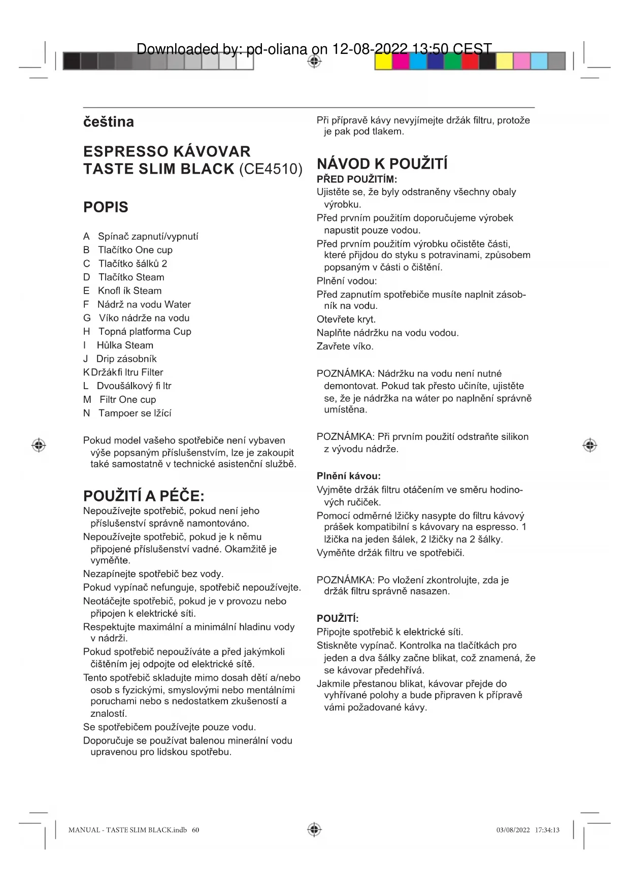 TASTE SLIM BLACK (CE4510) POPIS A Spínač zapnutí/vypnutí B Tlačítko One cup C Tlačítko šálků 2 D Tlačítko Steam E Knofl ík Steam F Nádrž na vodu Water G Víko nádrže na vodu H Topná platforma Cup I Hůlka Steam J Drip zásobník K Držák fi ltru Filter L Dvoušálkový fi ltr M Filtr One cup N Tampoer se lžící Pokud model vašeho spotřebiče není vybaven výše popsaným příslušenstvím, lze je zakoupit také samostatně v technické asistenční službě. POUŽITÍ A PÉČE: Nepoužívejte spotřebič, pokud není jeho příslušenství správně namontováno. Nepoužívejte spotřebič, pokud je k němu připojené příslušenství vadné. Okamžitě je vyměňte. Nezapínejte spotřebič bez vody. Pokud vypínač nefunguje, spotřebič nepoužívejte. Neotáčejte spotřebič, pokud je v provozu nebo připojen k elektrické síti. Respektujte maximální a minimální hladinu vody v nádrži. Pokud spotřebič nepoužíváte a před jakýmkoli čištěním jej odpojte od elektrické sítě. Tento spotřebič skladujte mimo dosah dětí a/nebo osob s fyzickými, smyslovými nebo mentálními poruchami nebo s nedostatkem zkušeností a znalostí. Se spotřebičem používejte pouze vodu. Doporučuje se používat balenou minerální vodu upravenou pro lidskou spotřebu. Při přípravě kávy nevyjímejte držák fi ltru, protože je pak pod tlakem.