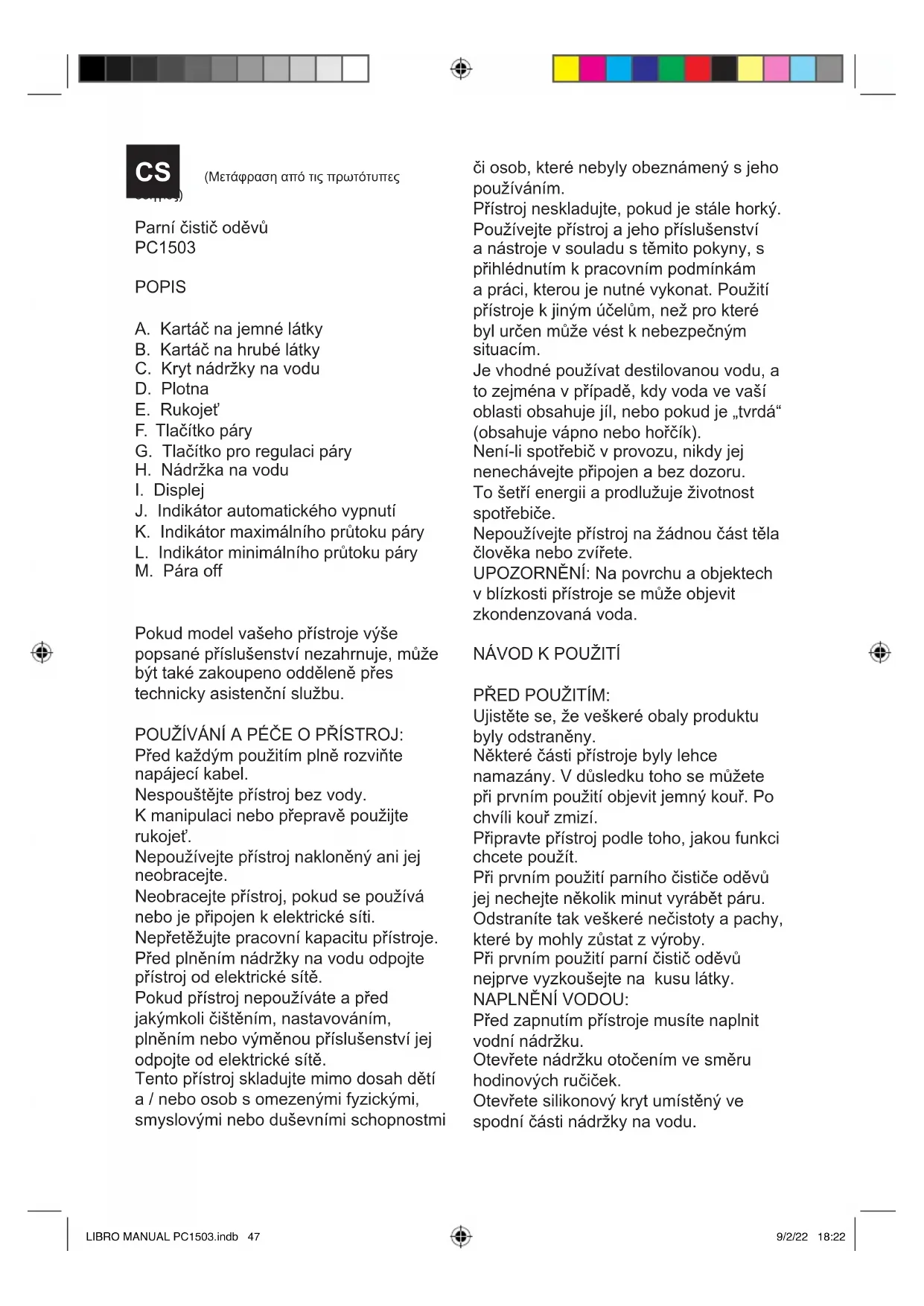 LIBRO MANUAL PC1503.indb 46LIBRO MANUAL PC1503.indb 46 9/2/22 18:229/2/22 18:22Parní čistič oděvů PC1503 POPIS A. Kartáč na jemné látky B. Kartáč na hrubé látky C. Kryt nádržky na vodu D. Plotna E. Rukojeť F. Tlačítko páry G. Tlačítko pro regulaci páry H. Nádržka na vodu